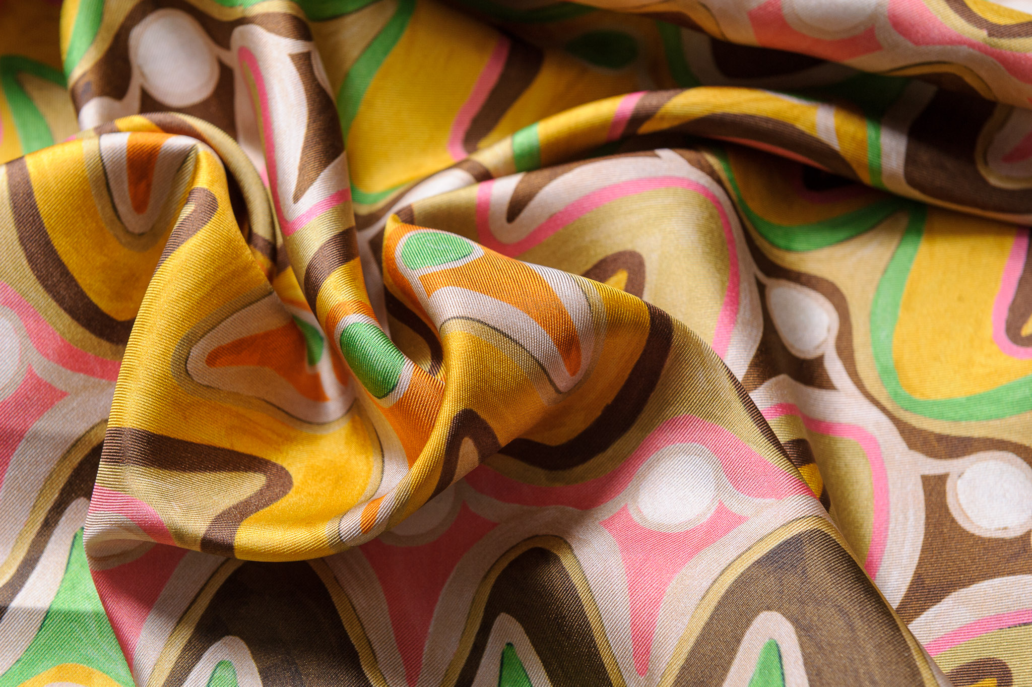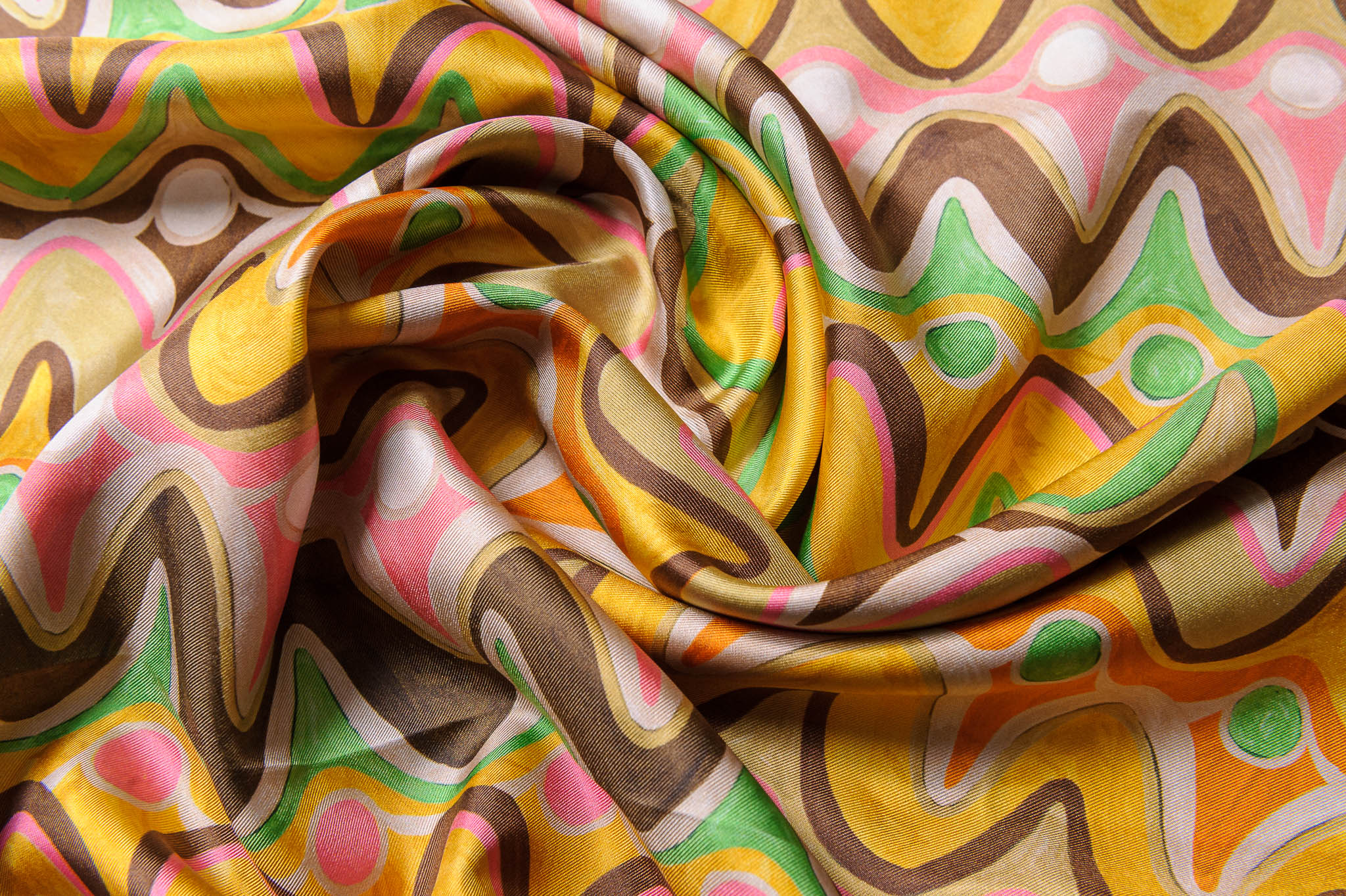 Materiał nie prześwituje, delikatnie sztywniejszy. Wzór w szlaczki żółto-zielone. Odpowiedni na sukienki, koszule, bluzki, spódnice.