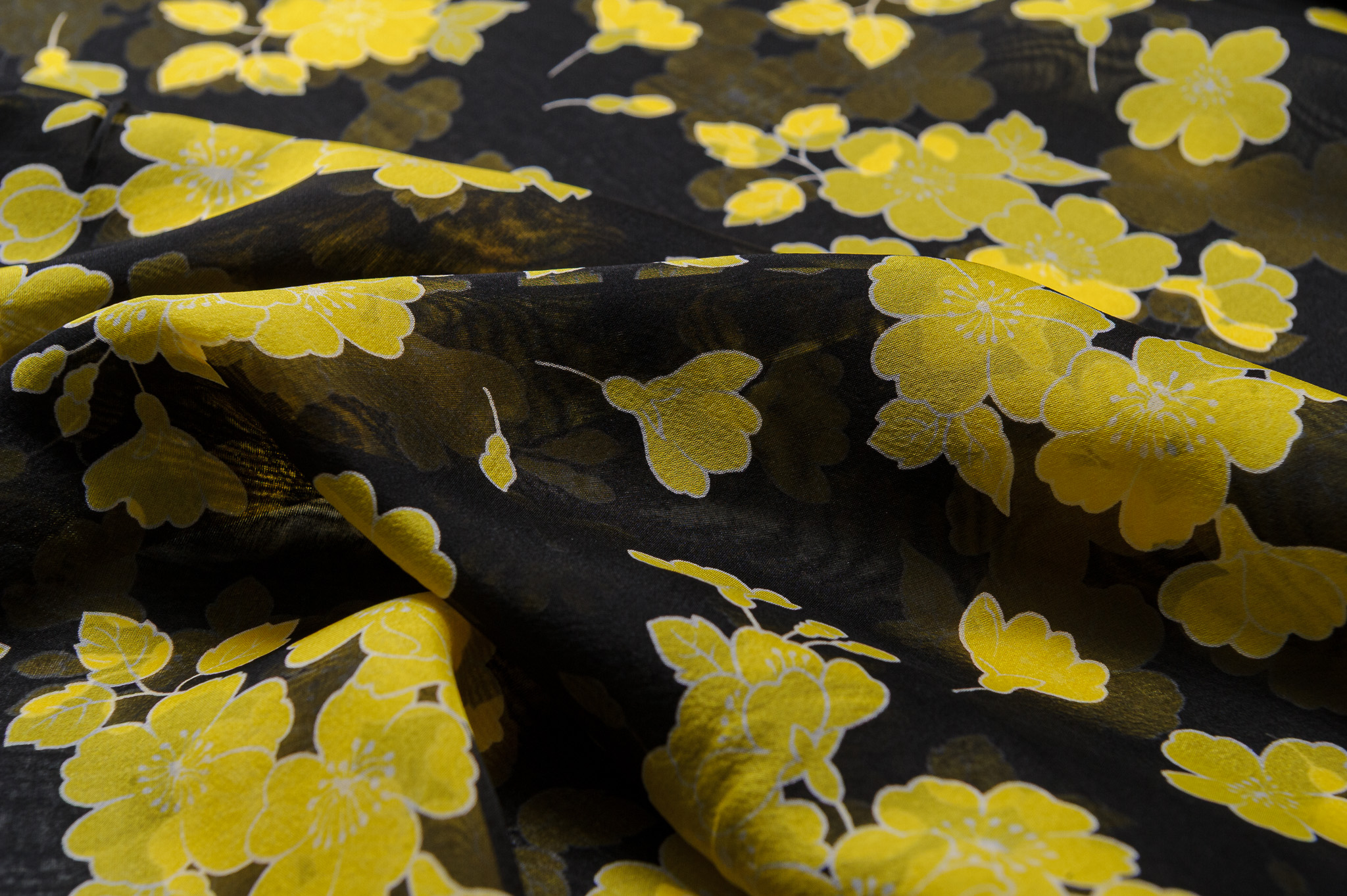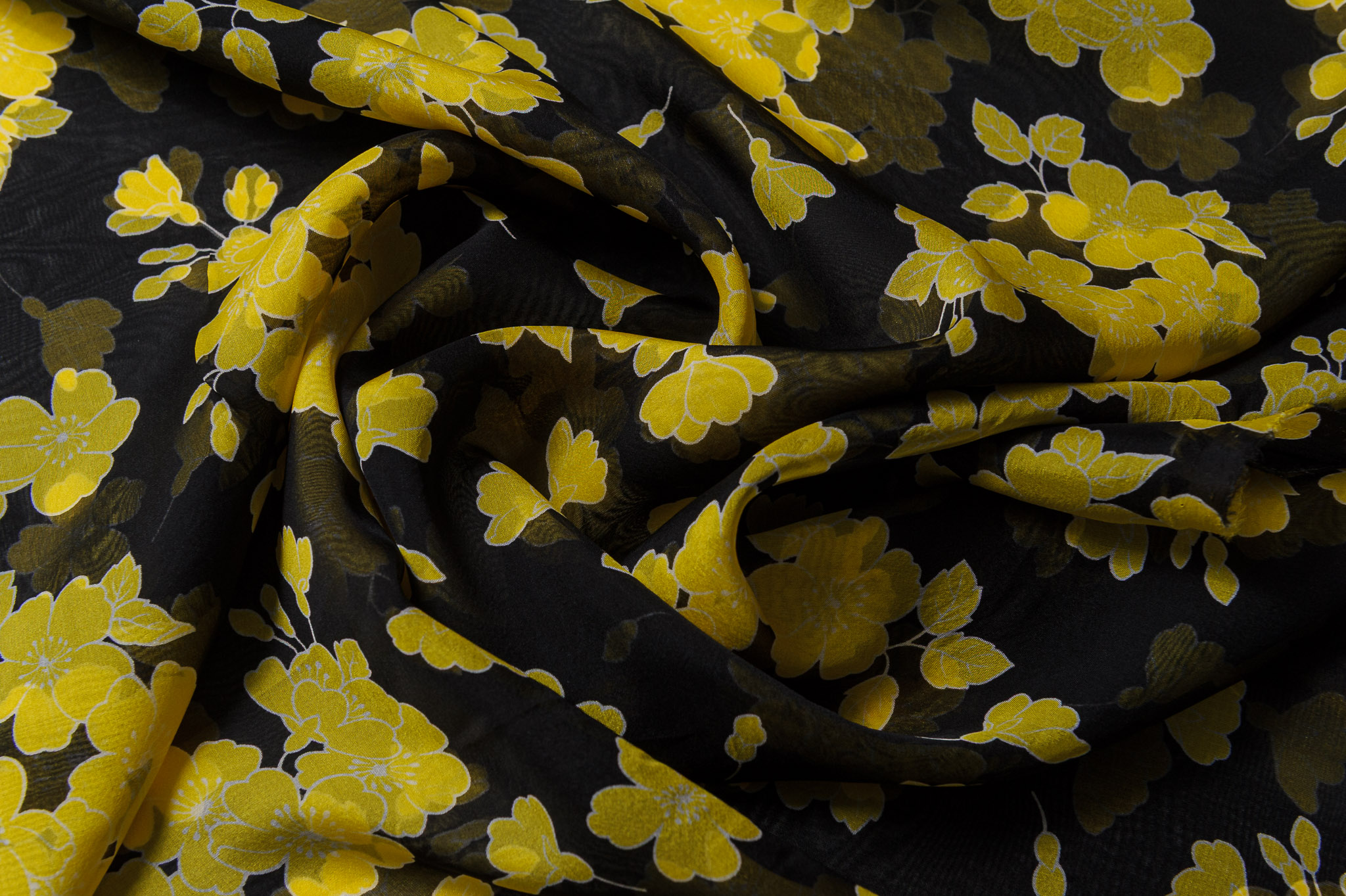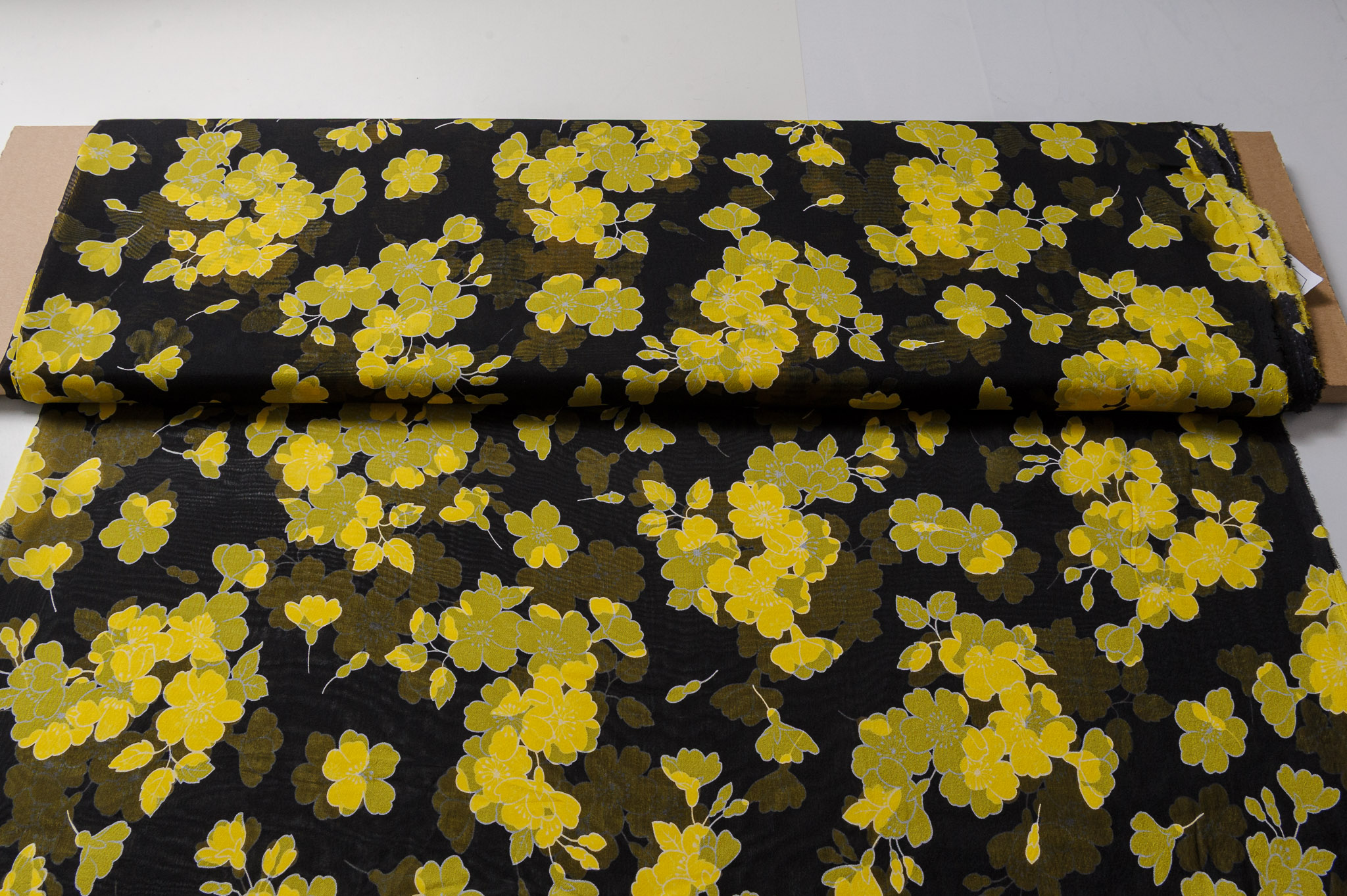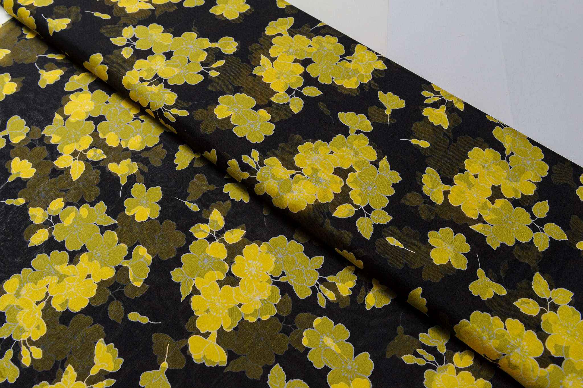 Materiał cienki, prześwitujący. Wzór w żółte kwiatuszki na czarnym tle. Odpowiedni na bluzki, koszule, spódnice.