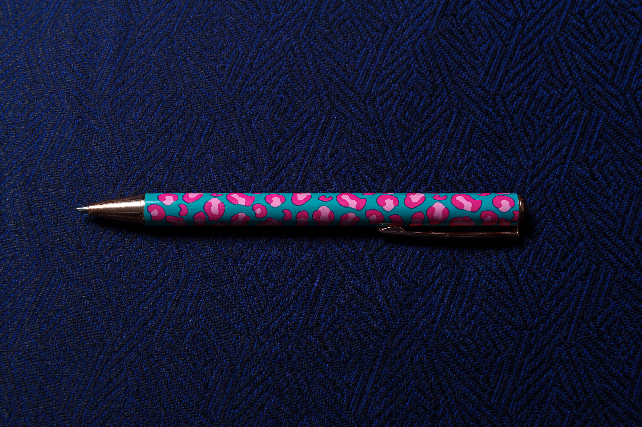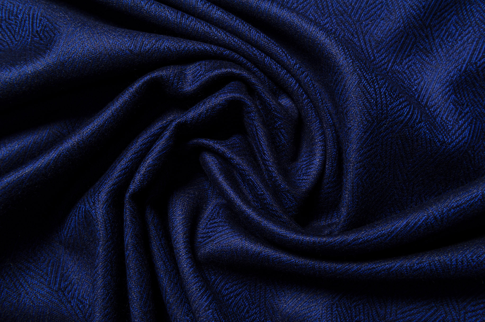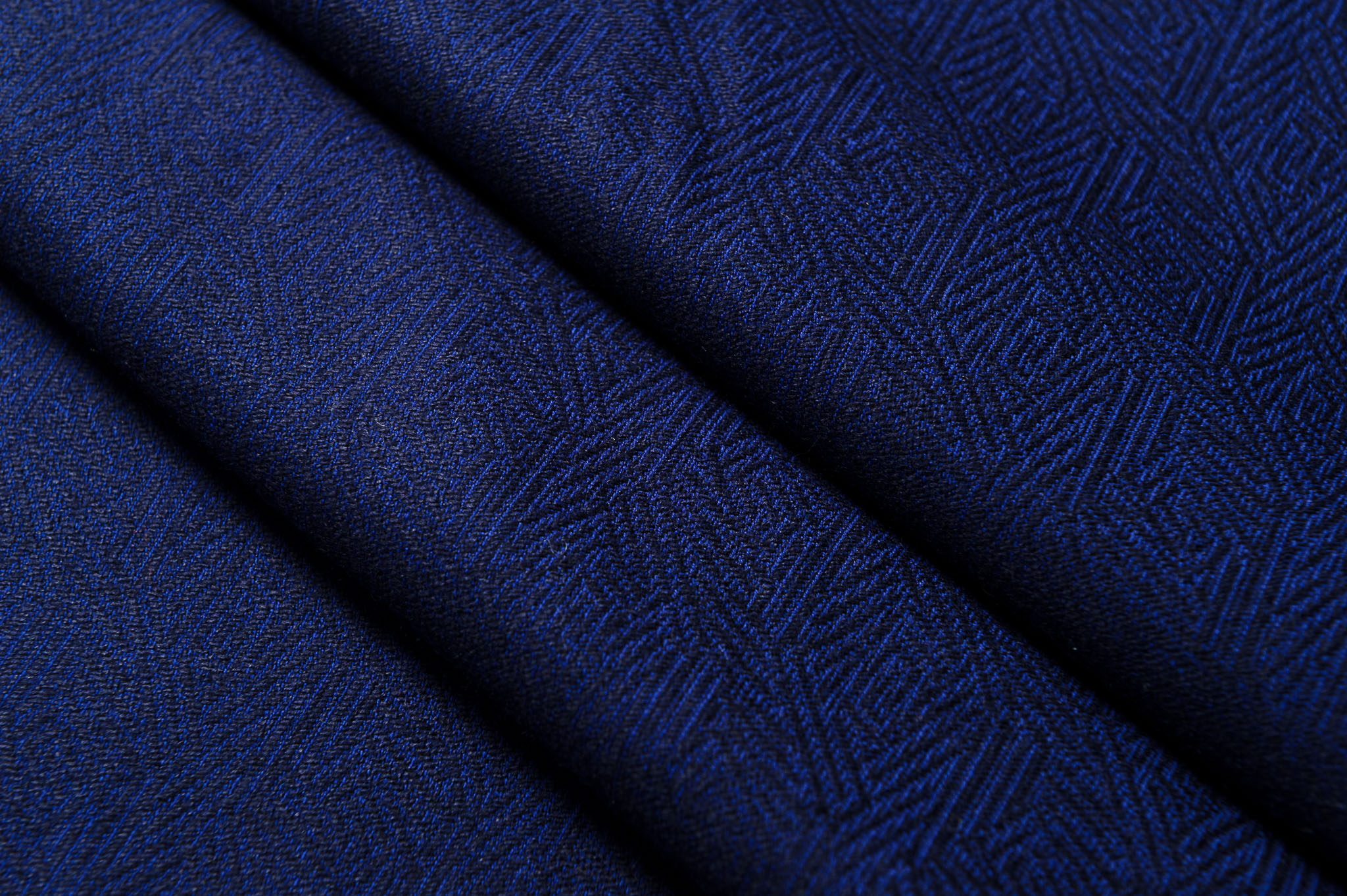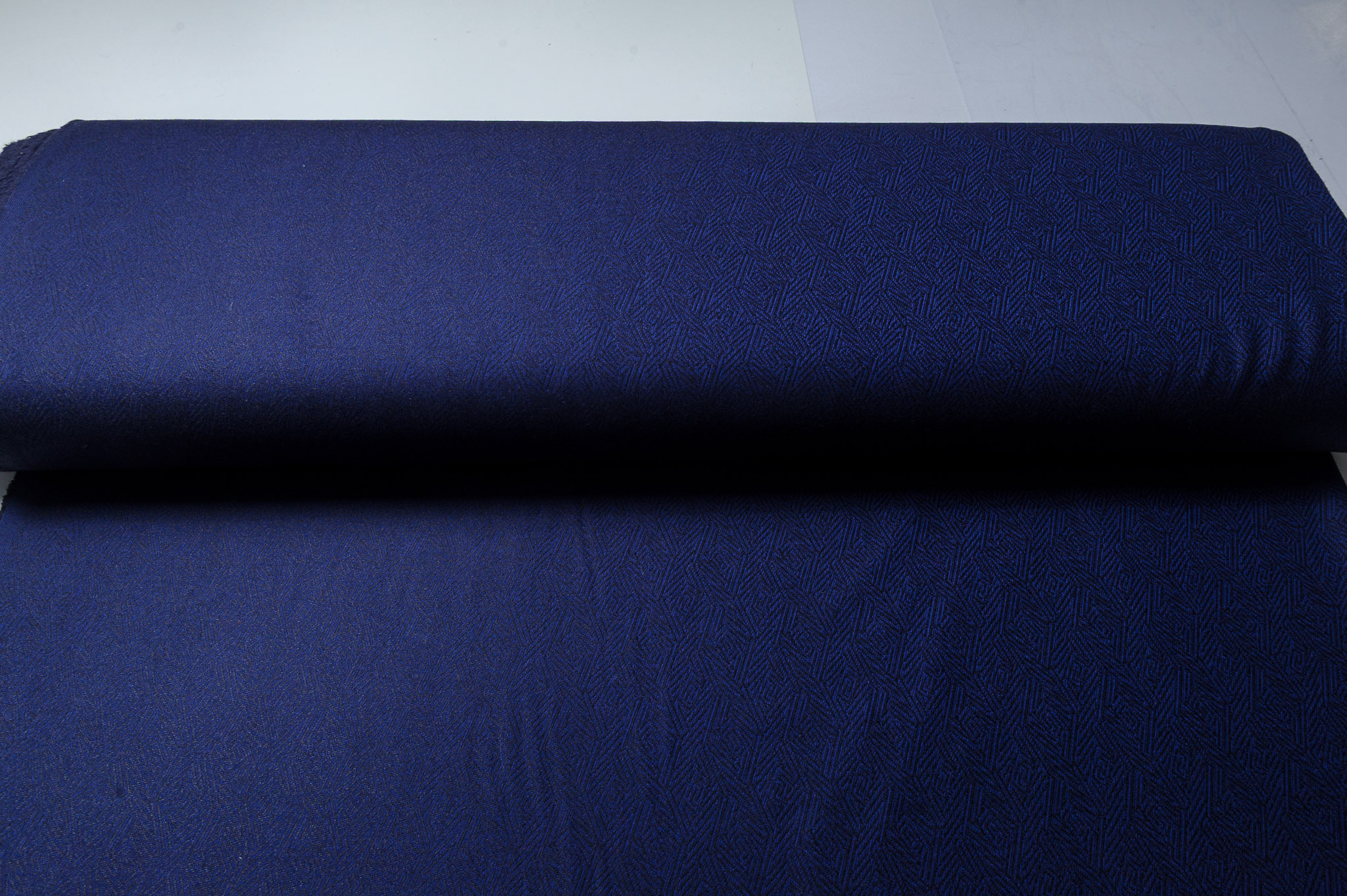 Materiał dość cienki, z delikatnym połyskiem. Wzorek tłoczony, kolor granatowy. Odpowiedni na sukienki, spódniczki, żakiet, cienki płaszcz, spodenki.