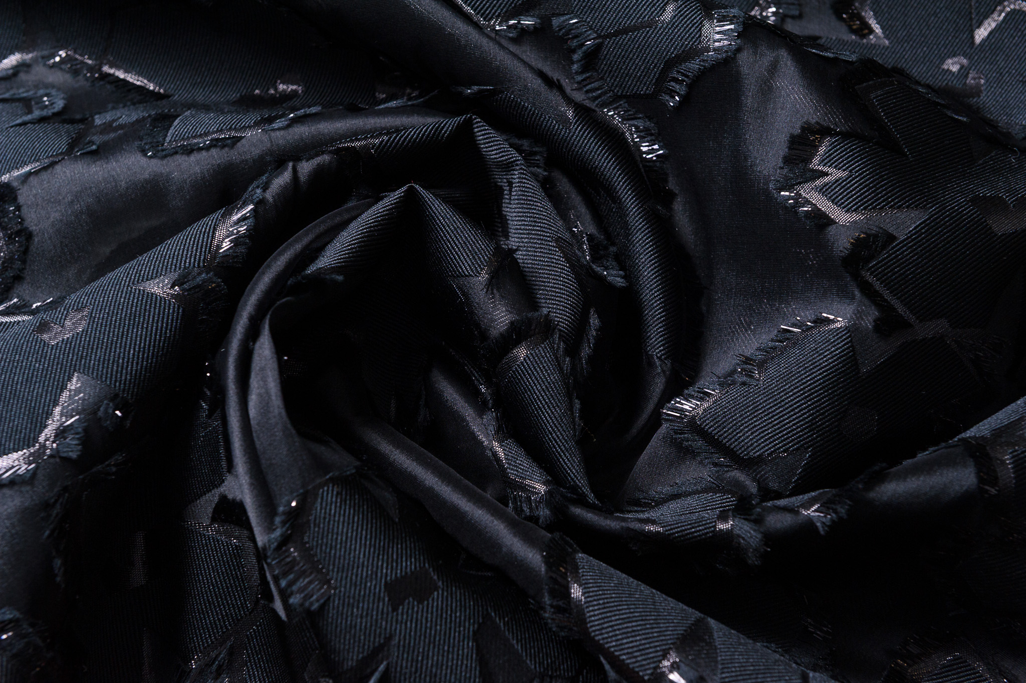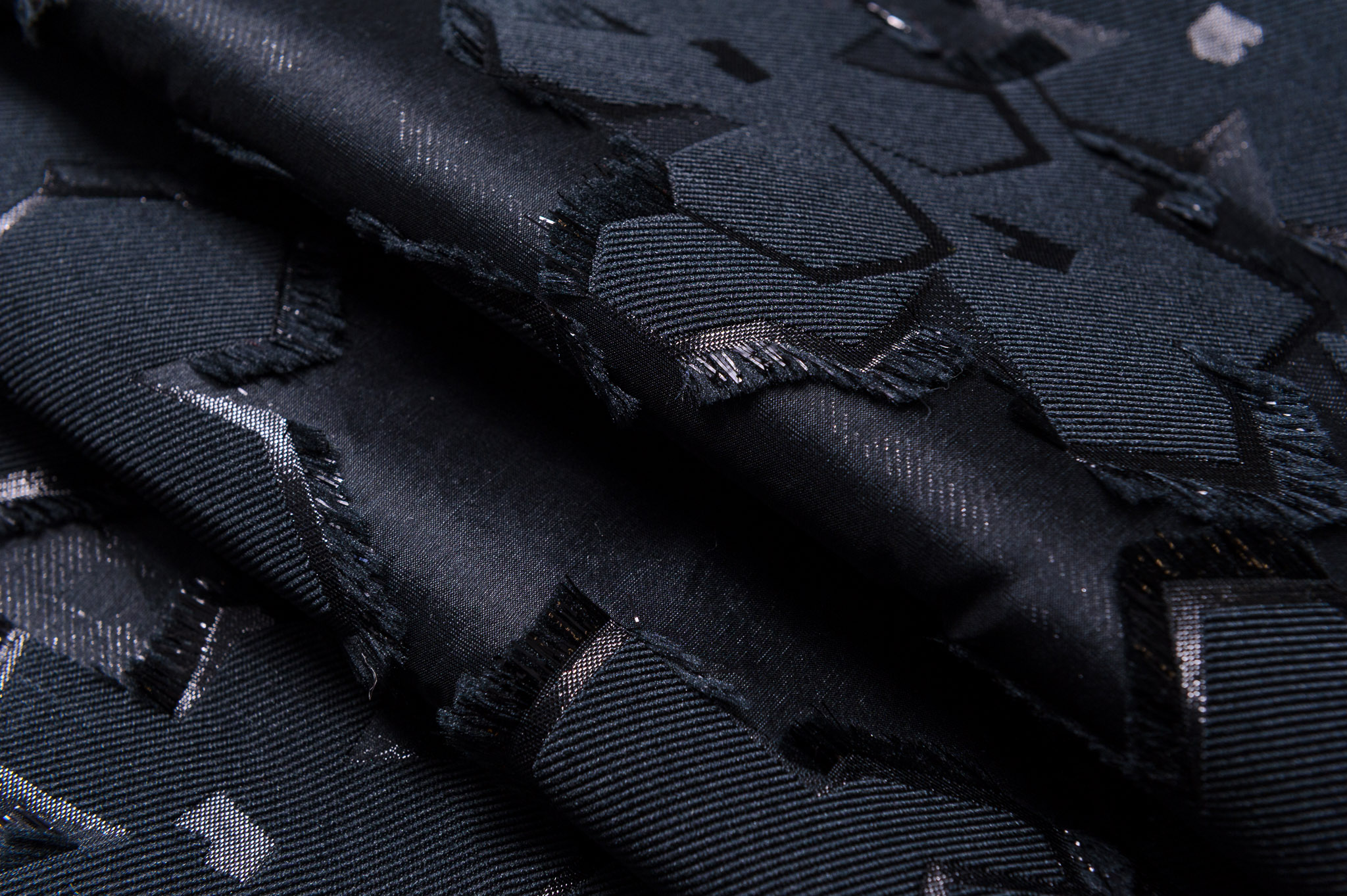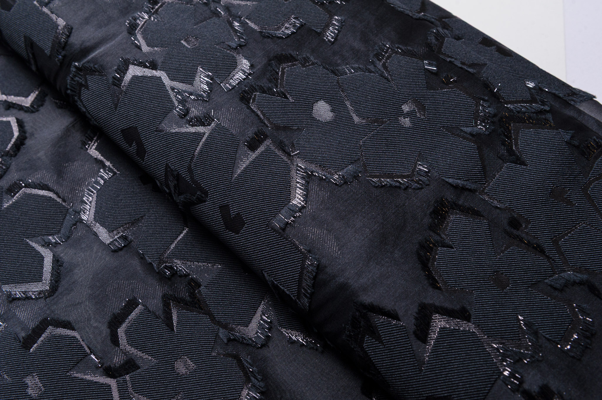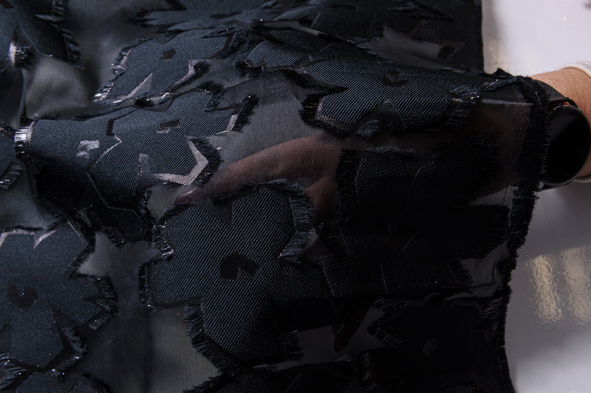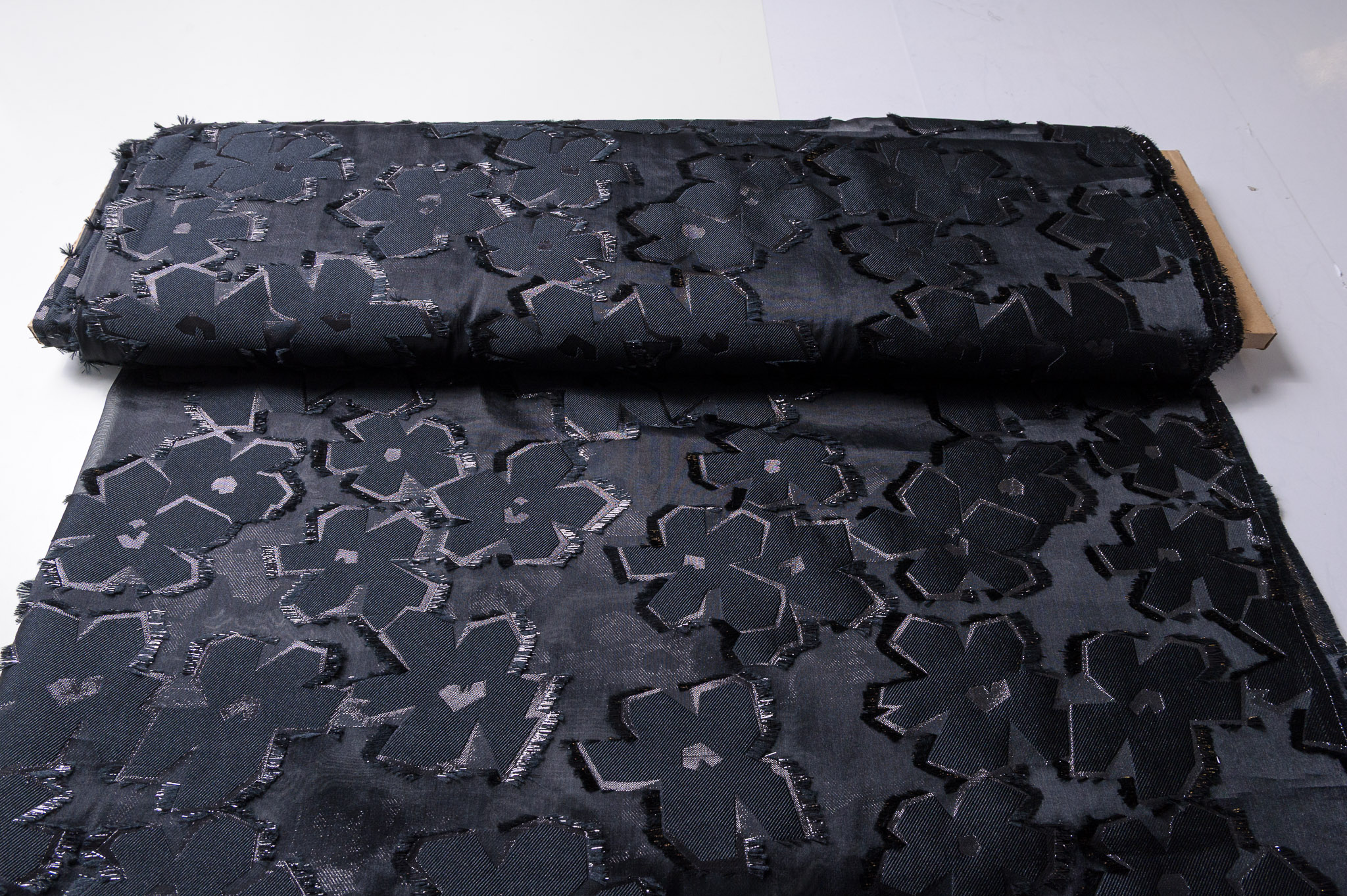 Materiał sztywniejszy, miejscami prześwitujący. Kolor czarny, kwiaty 3d. Odpowiedni na sukienki, spódnice, koszule.