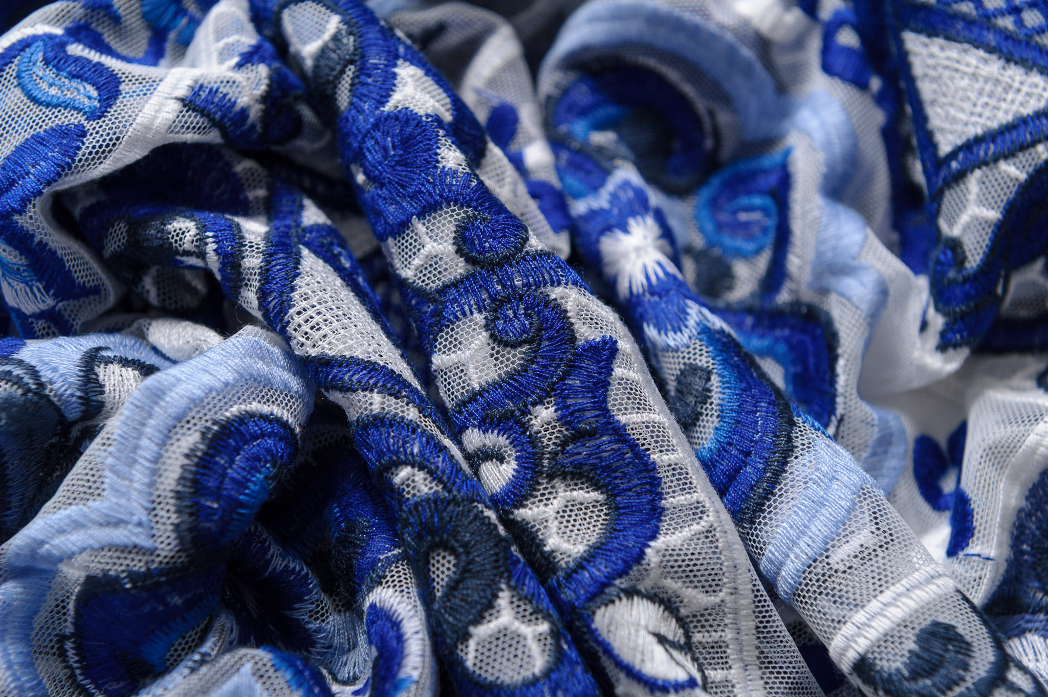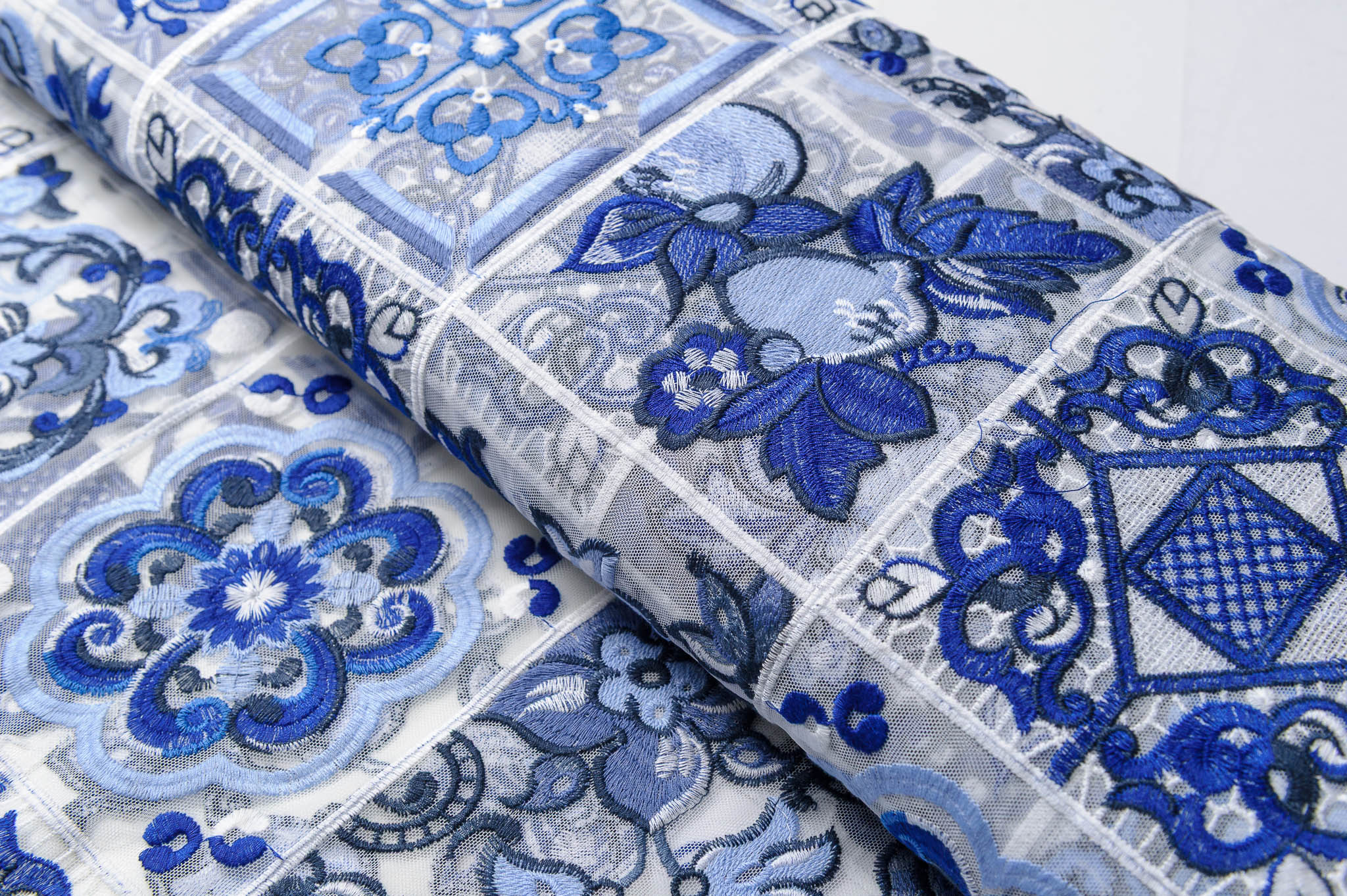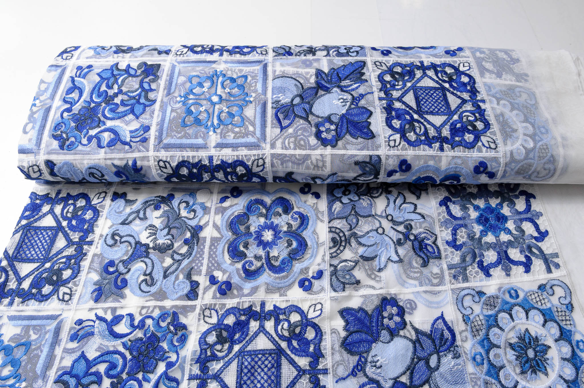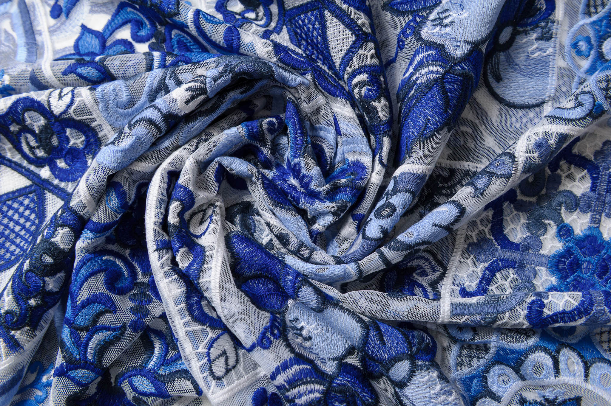 Wzór majolika niebiesko-śmietanowy. Odpowiednia na sukienki, spódnice, dodatki.