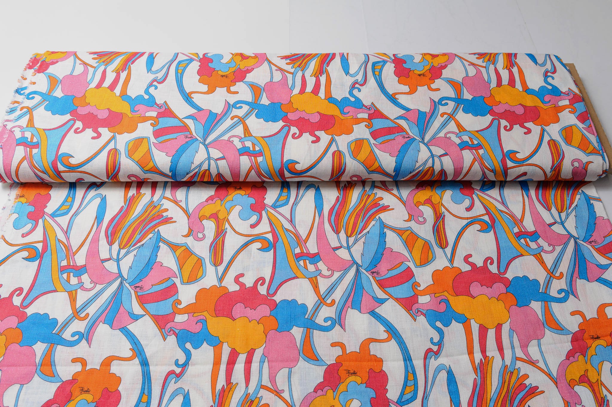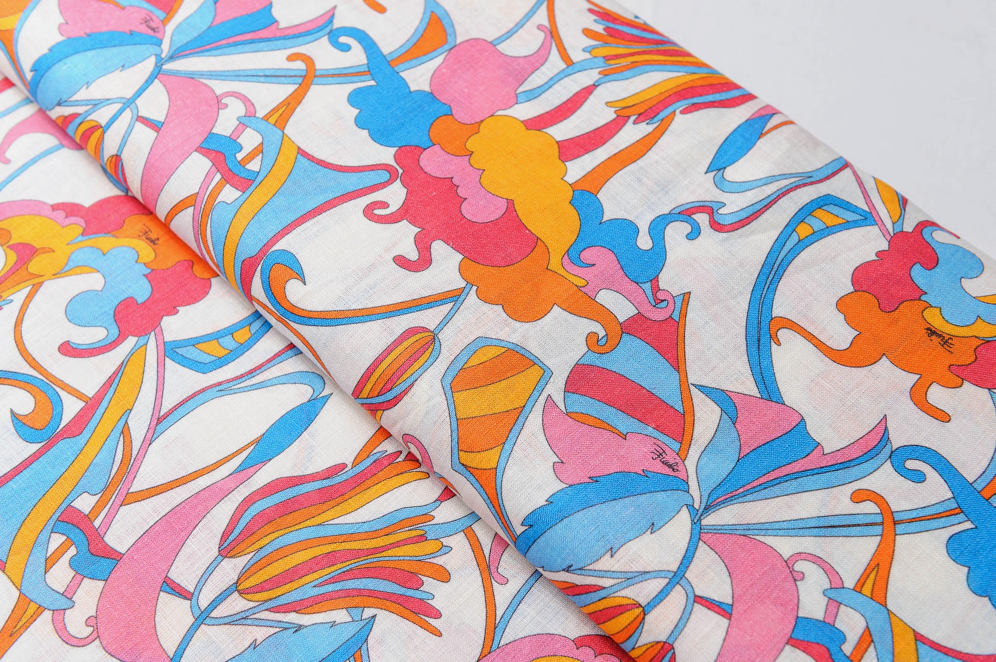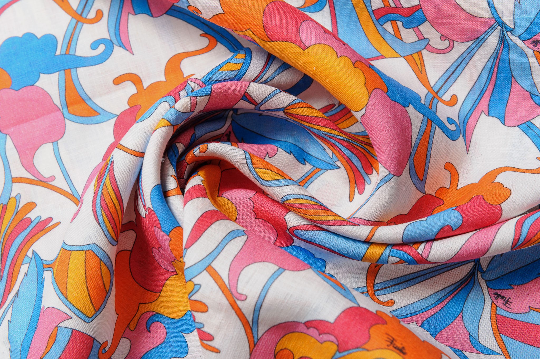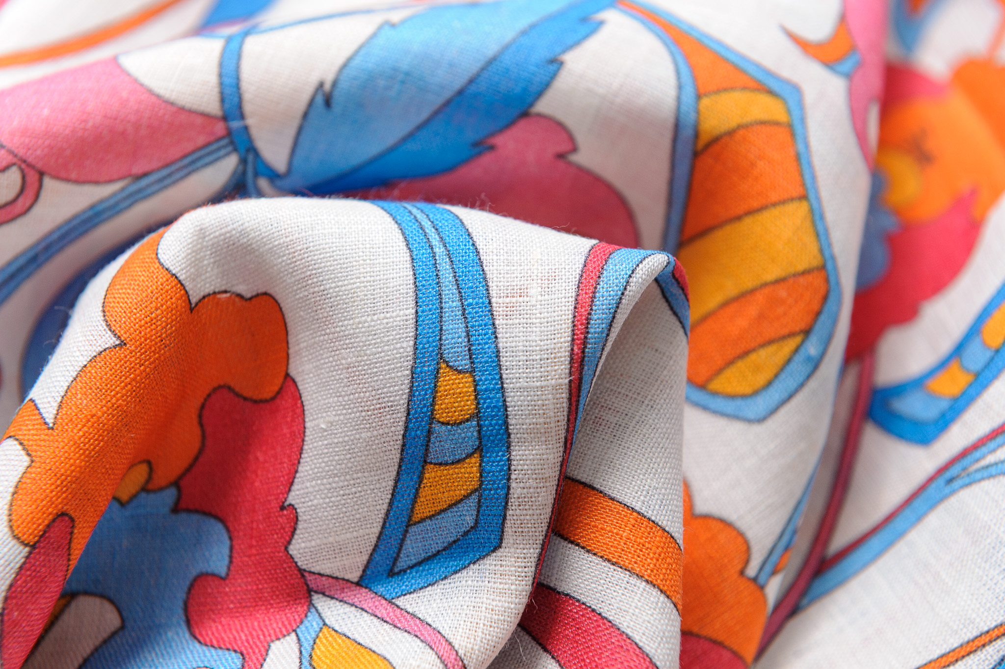 Materiał sztywniejszy, przewiewny, trwały. Lekko szorstka faktura. Geometryczne wzory w kolorze białym,niebieskim, pomarańczowym. Odpowiedni na koszule, sukienki, spodnie, spódnice, narzutki.