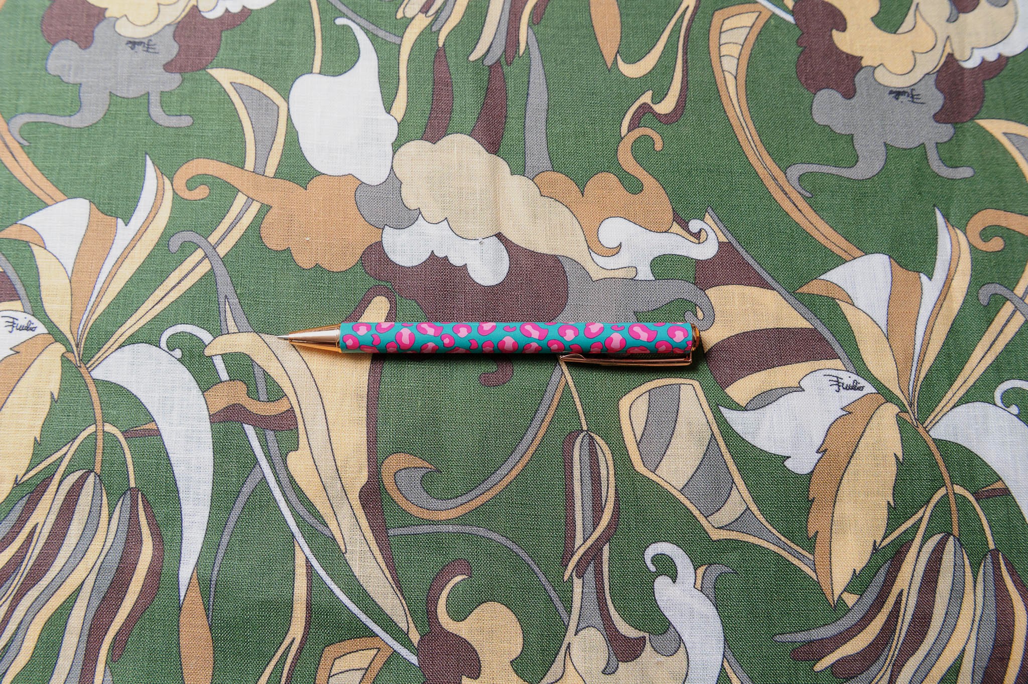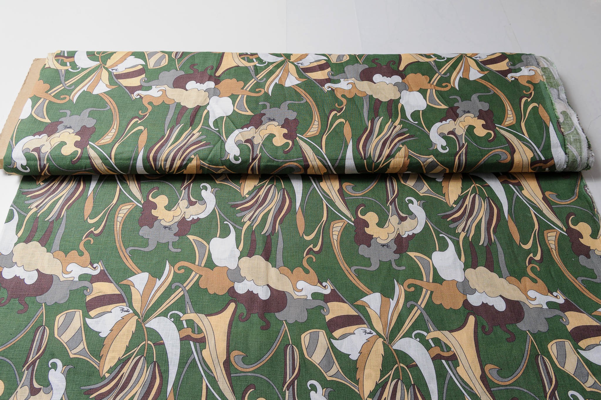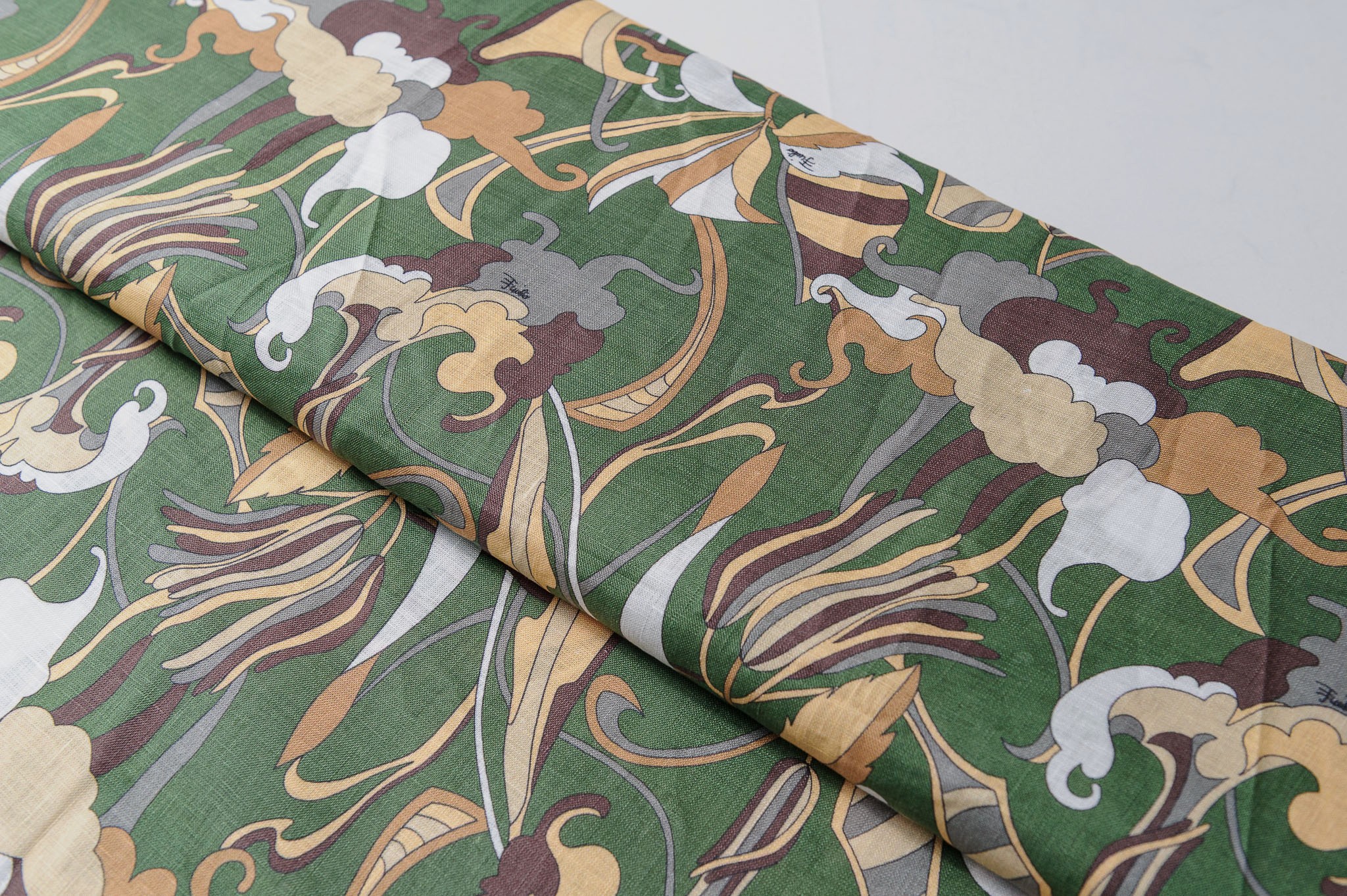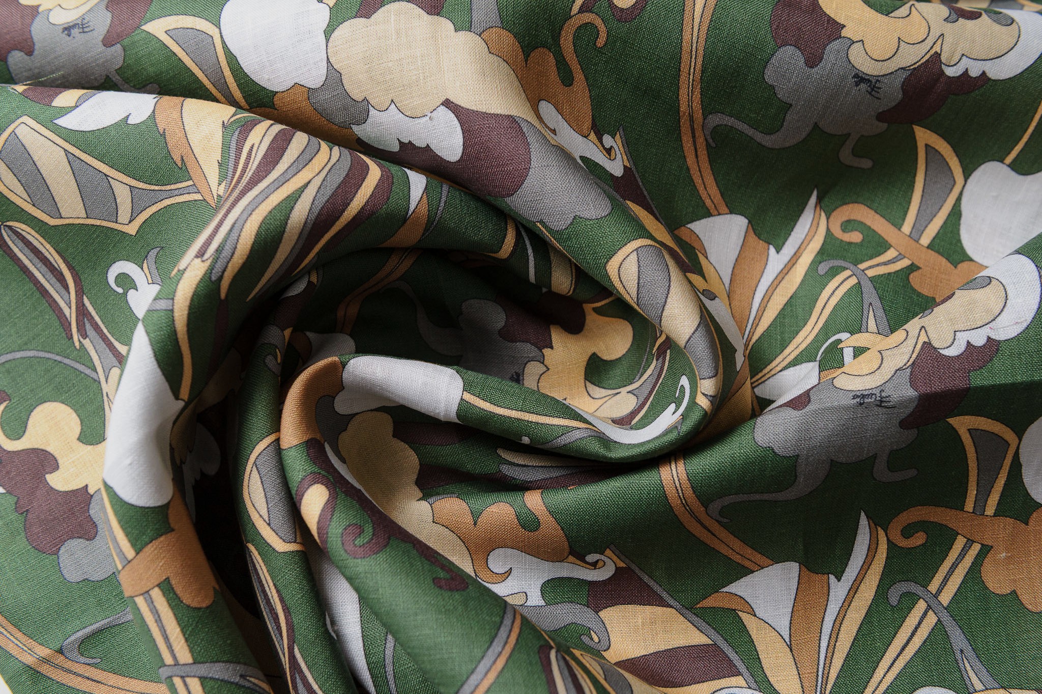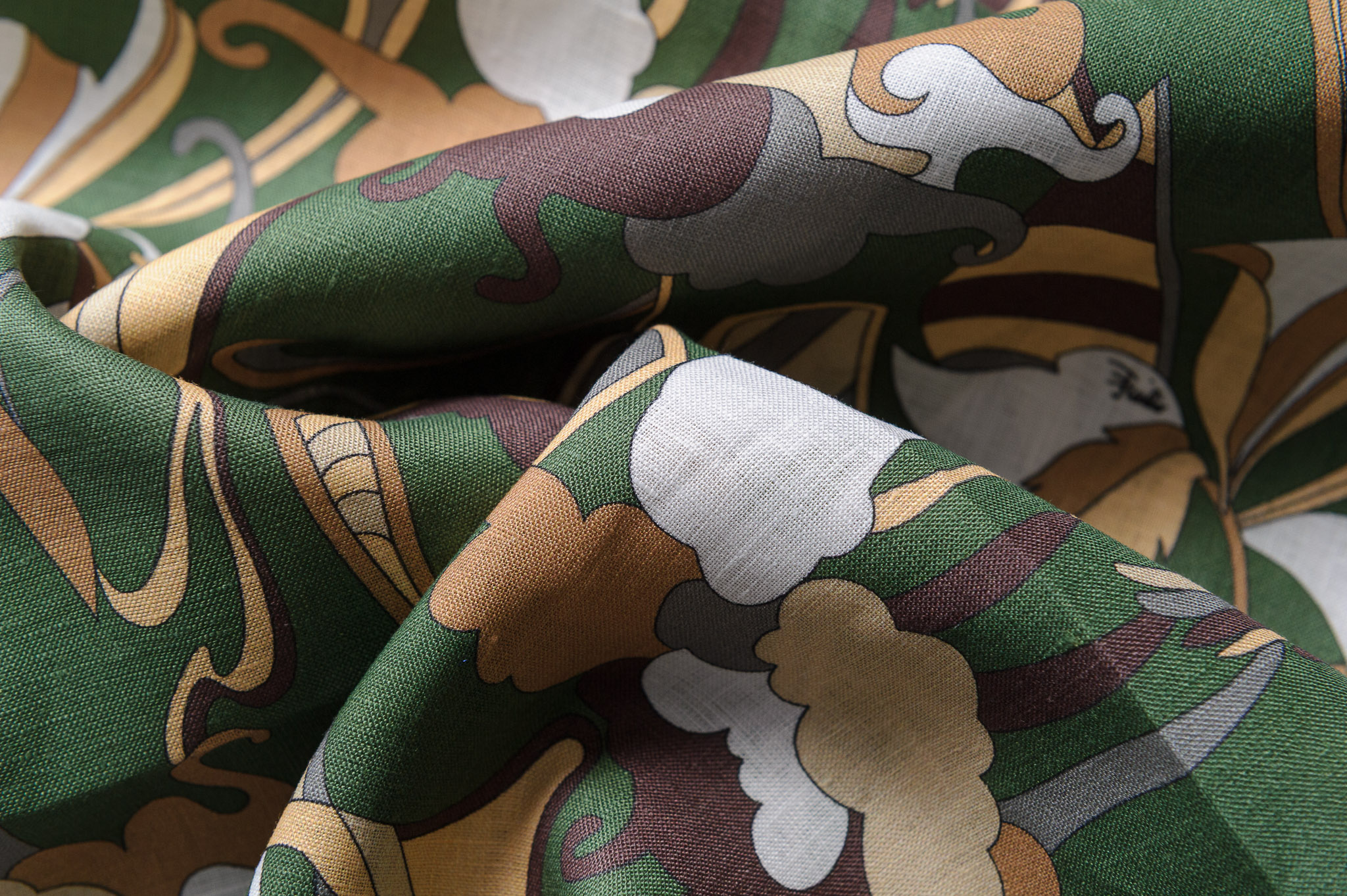 Materiał sztywniejszy, przewiewny, trwały. Lekko szorstka faktura. Geometryczne wzory w kolorze zielonym, brązowym, beżu. Odpowiedni na koszule, sukienki, spodnie, spódnice, narzutki.