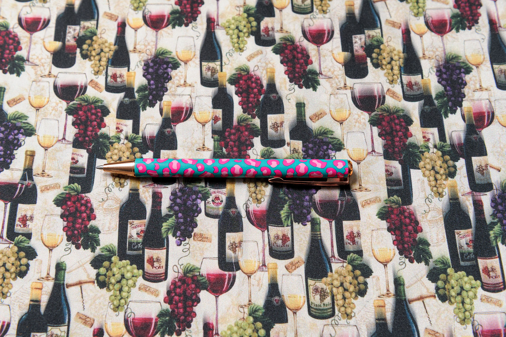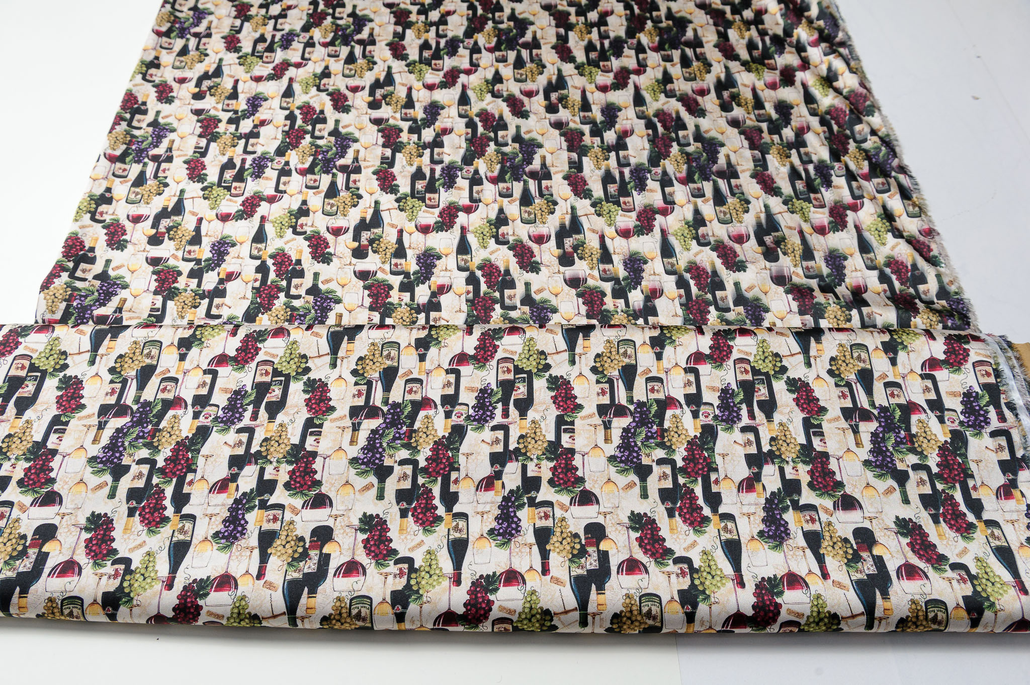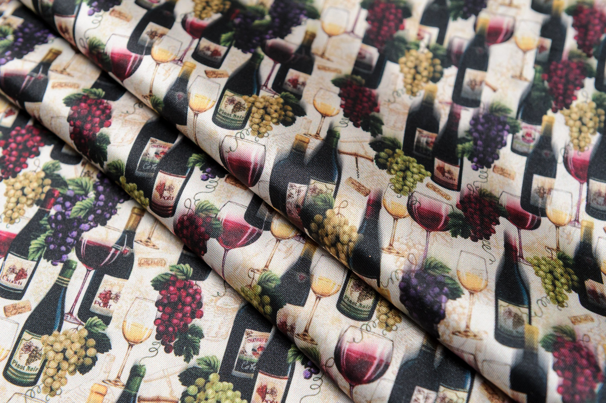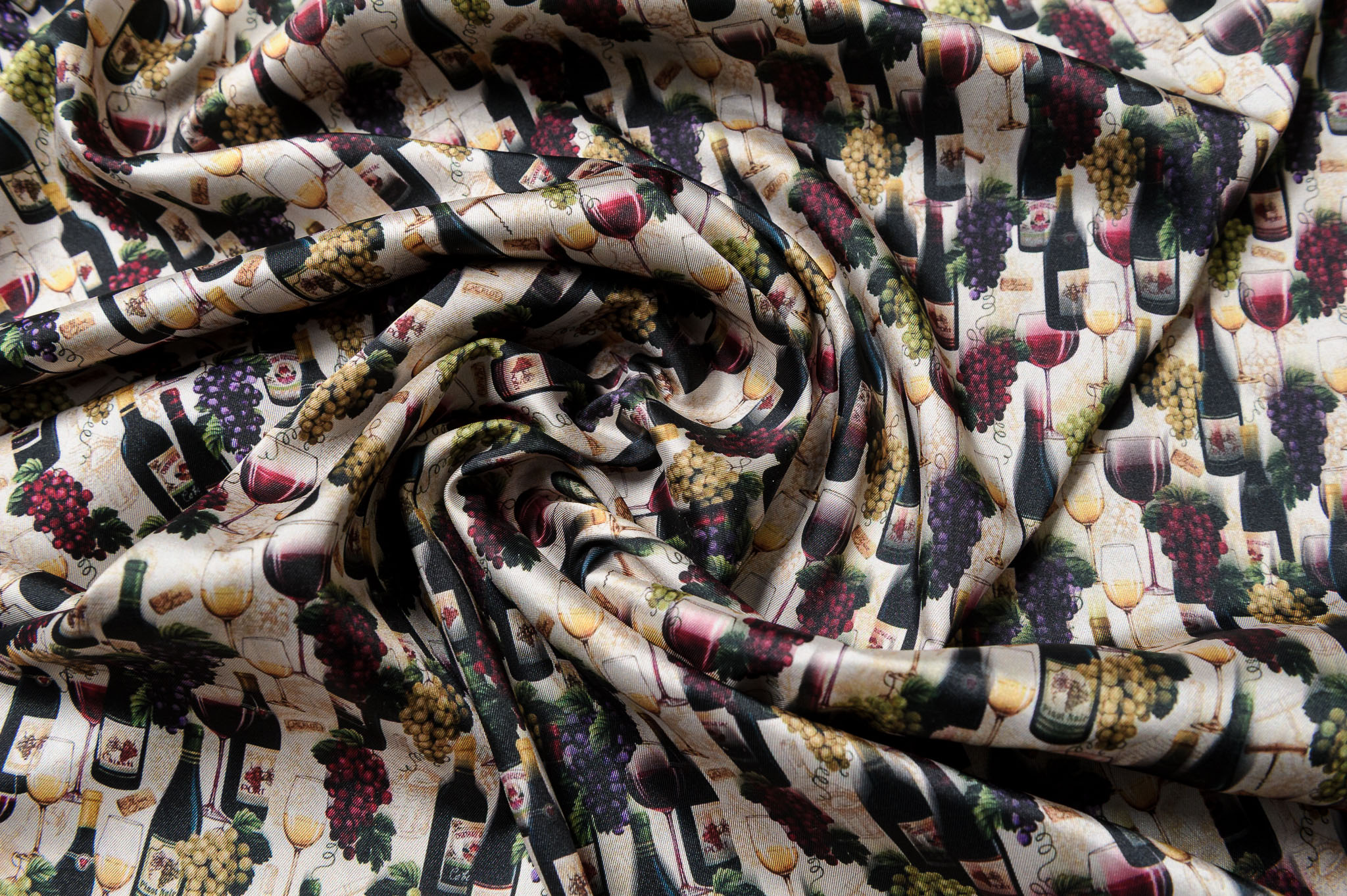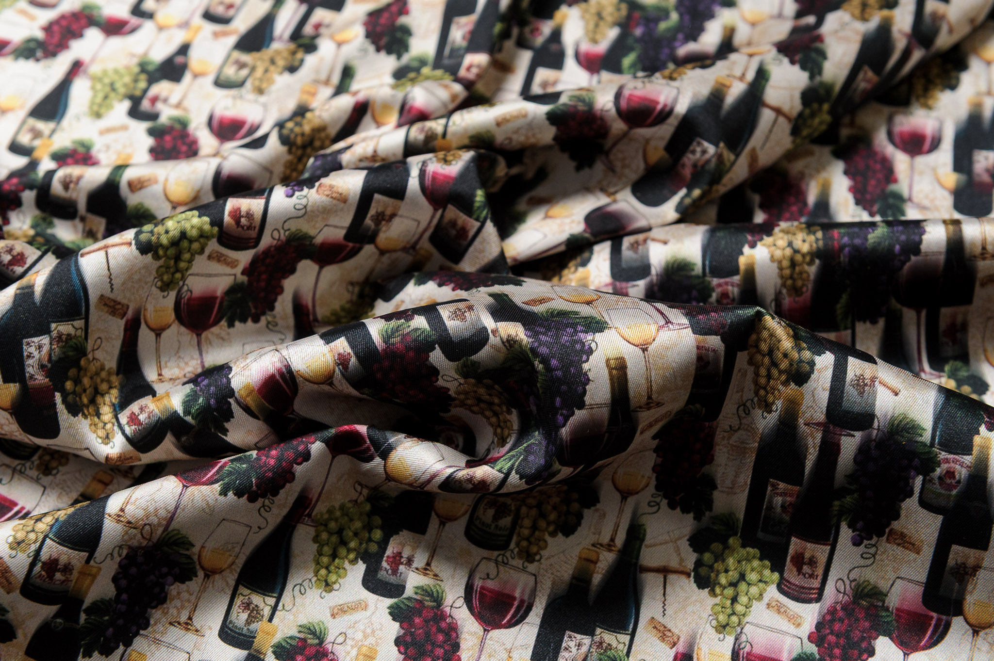 Materiał przypomina jedwab twill. Wzór w wina. Odpowiedni na sukienki, koszule, spódnice.