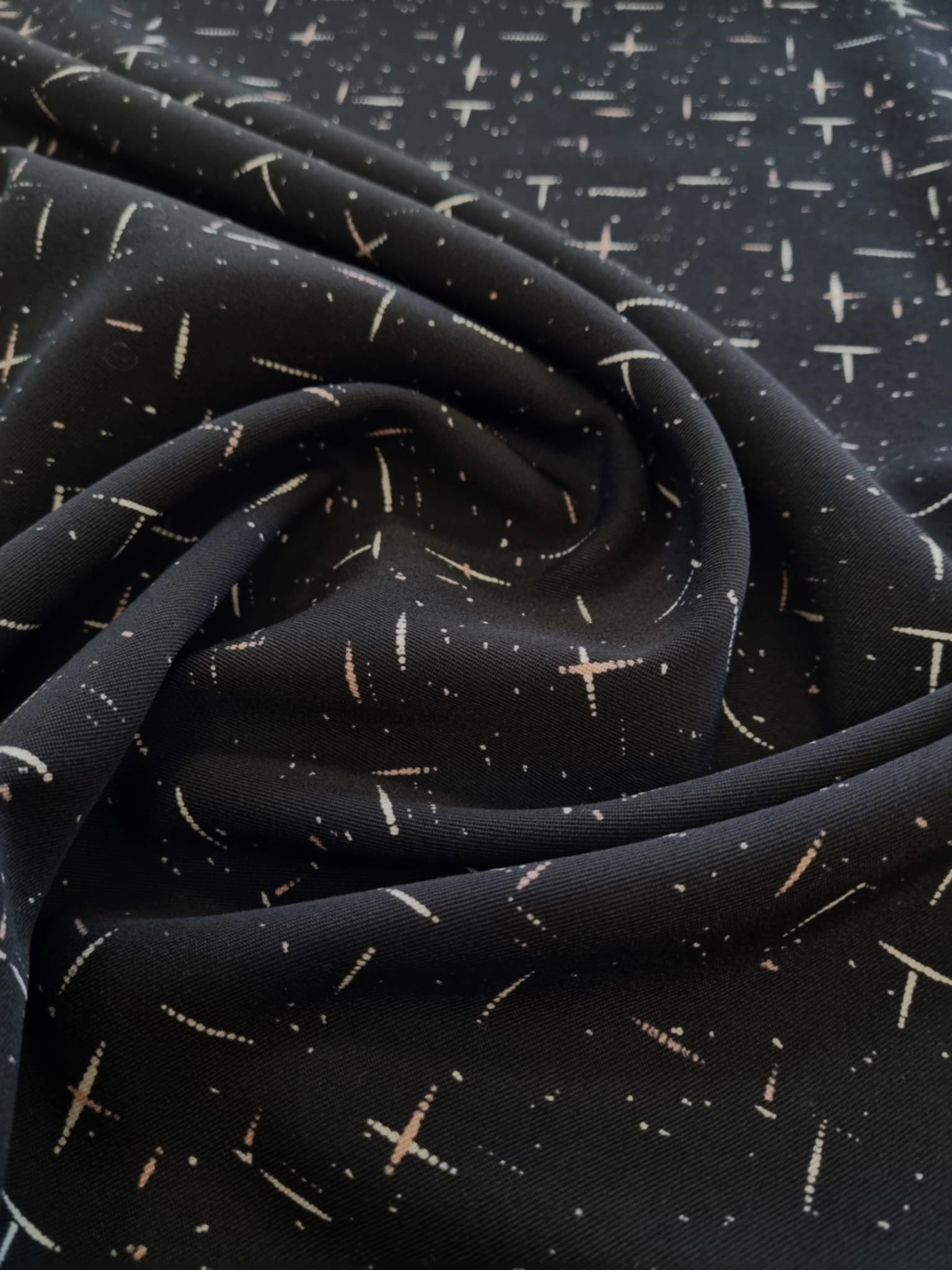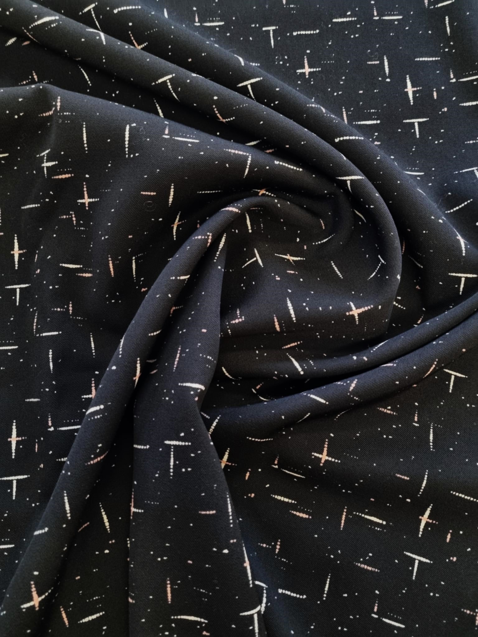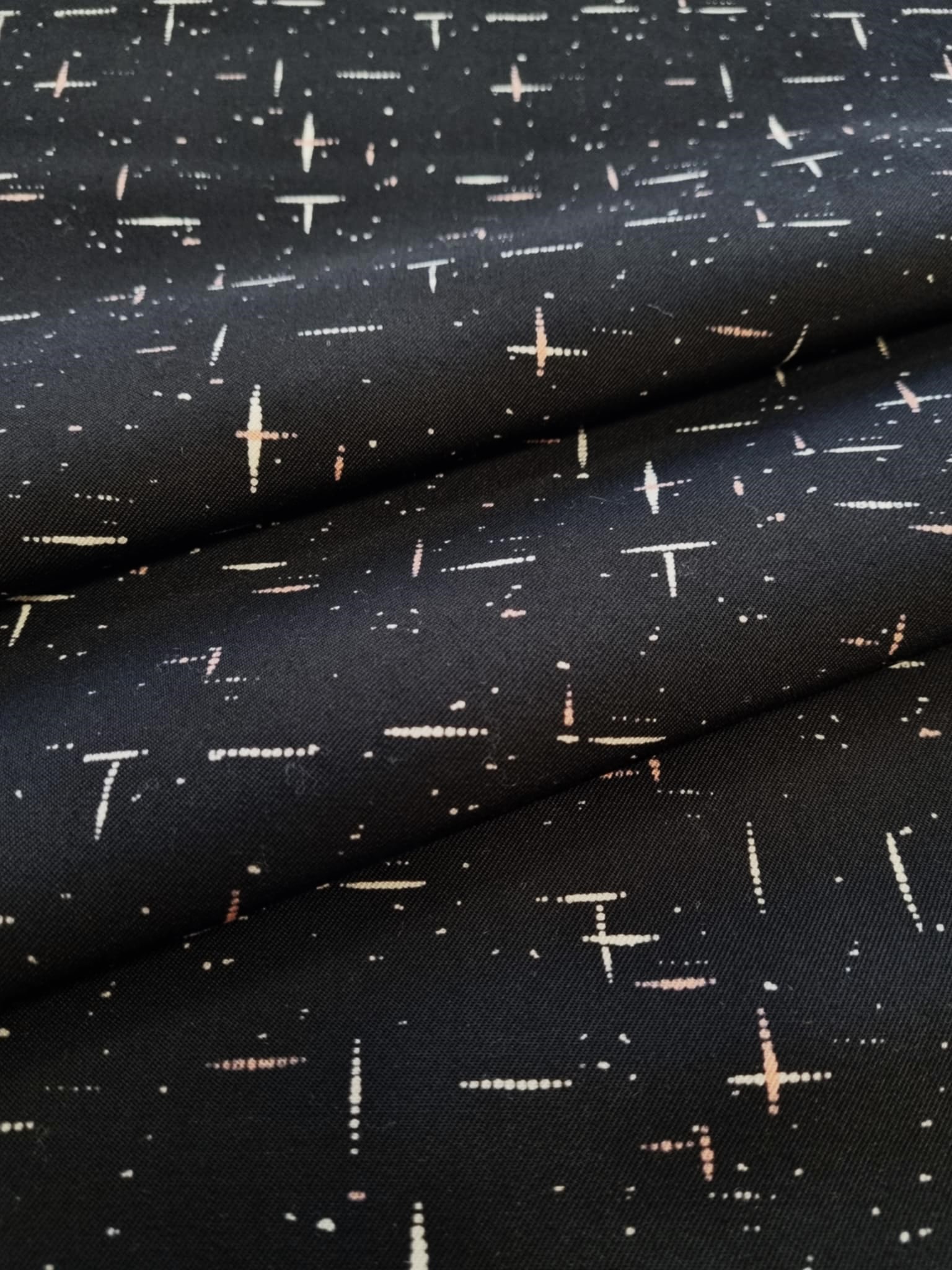 Materiał w drobne wzory, kropki, linie, plusy na czarnym tle. Odpowiednie na sukienki, spódnice, spodenki,marynarki.