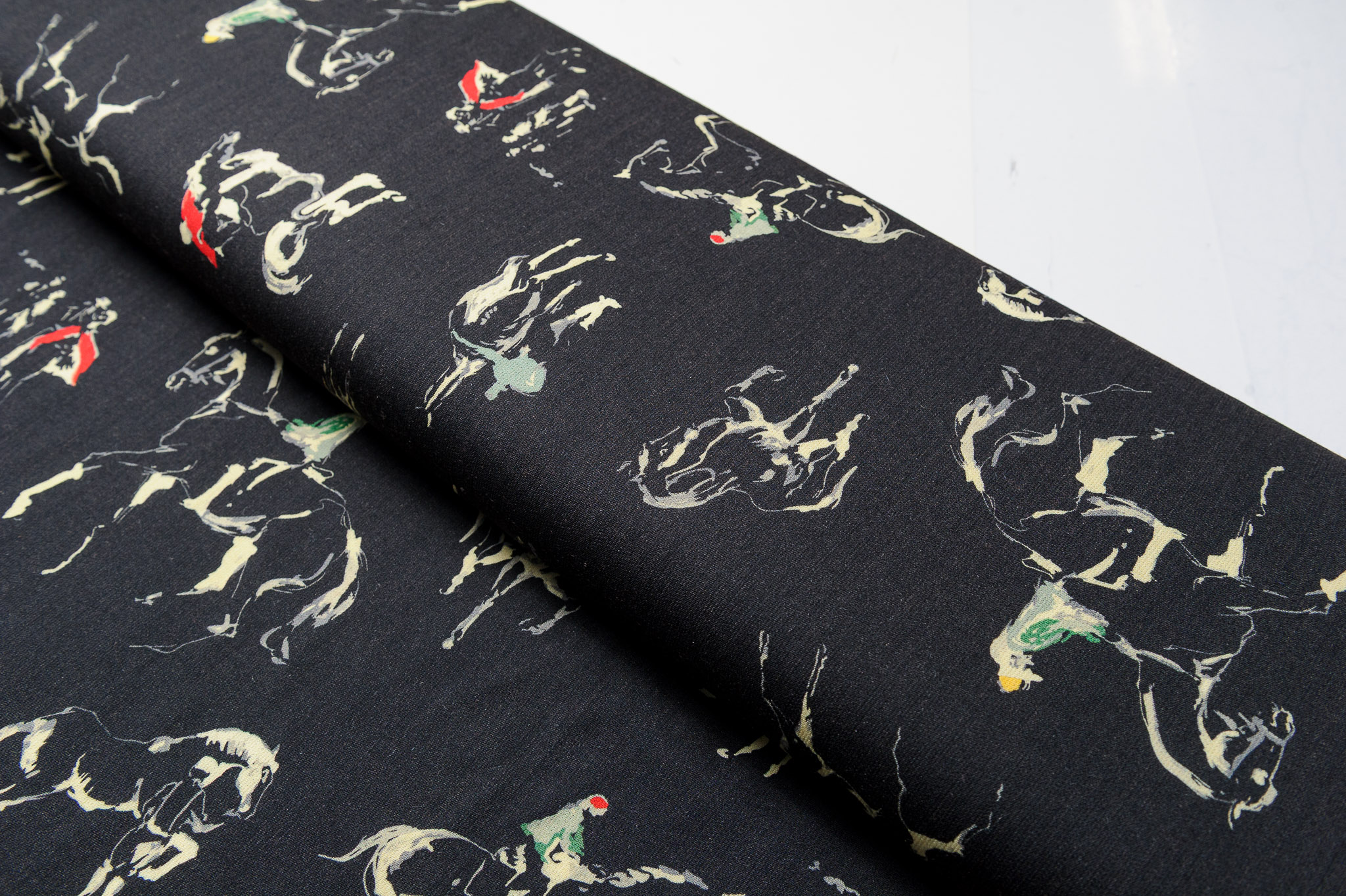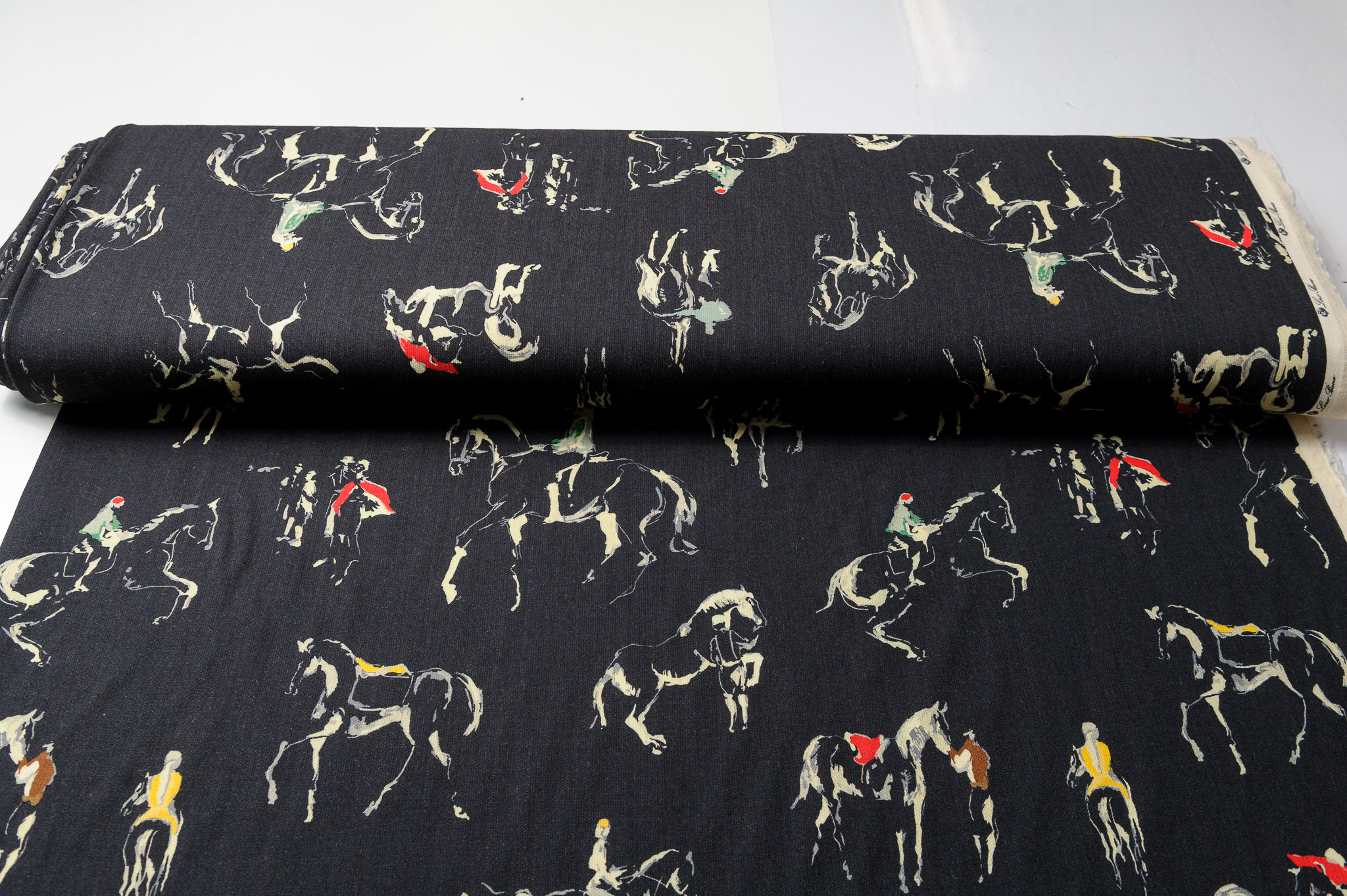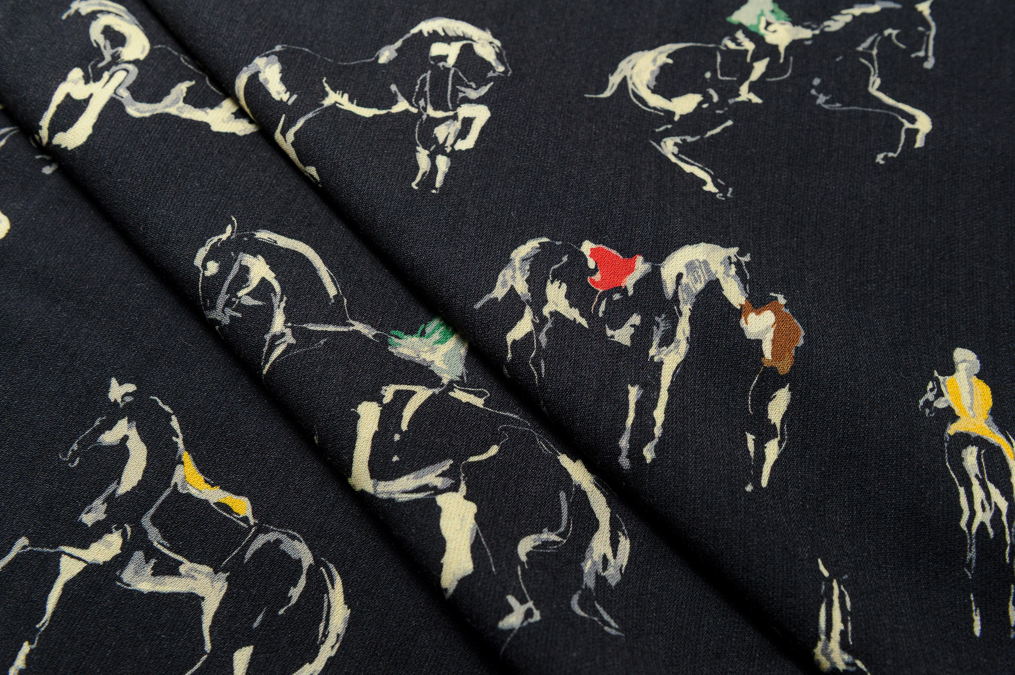 Materiał naturalny, miękki. Nie prześwituje. Wzór w konie na przygaszonym czarnym tle. Odpowiedni na marynarkę, spodnie, spódnicę, sukienkę.