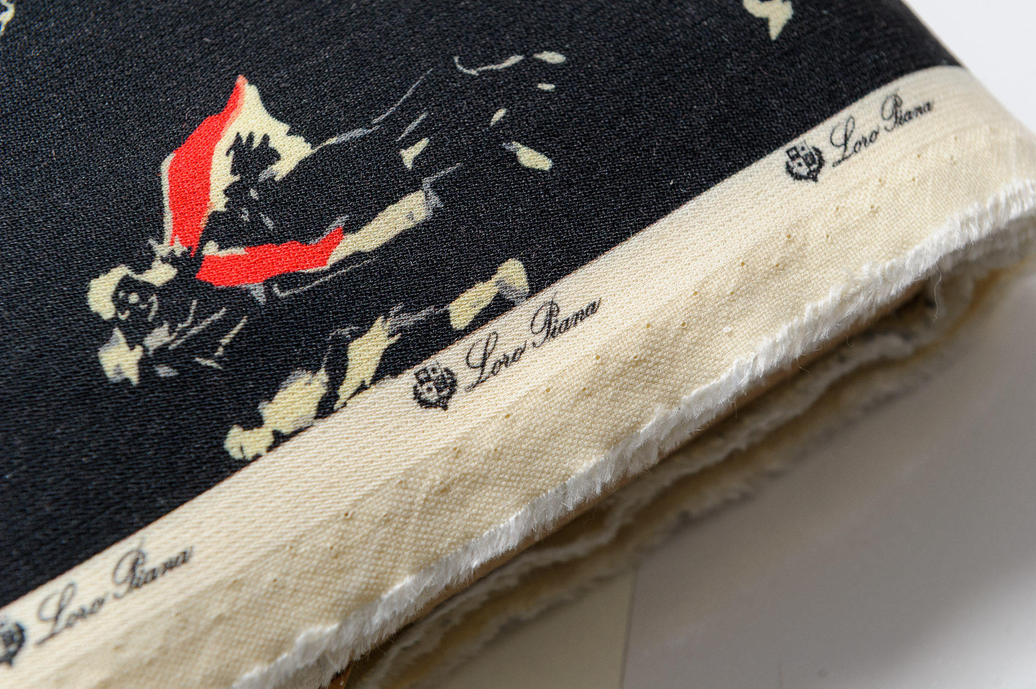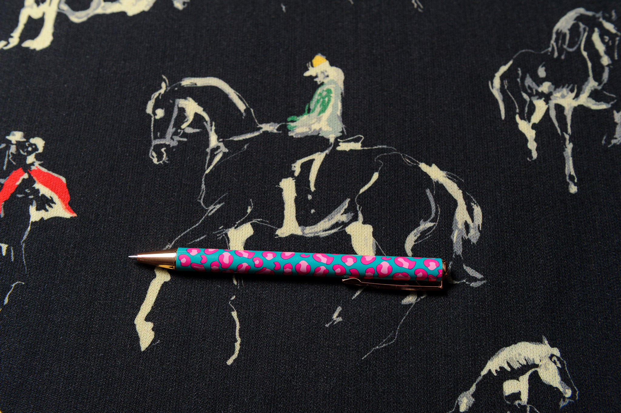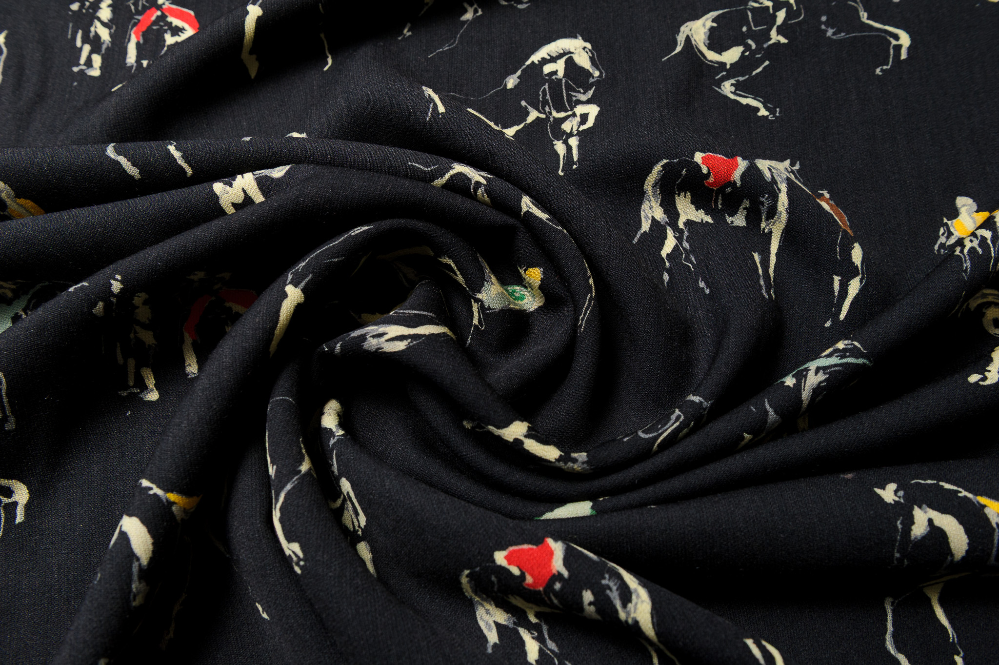 Materiał naturalny, miękki. Nie prześwituje. Wzór w konie na przygaszonym czarnym tle. Odpowiedni na marynarkę, spodnie, spódnicę, sukienkę.