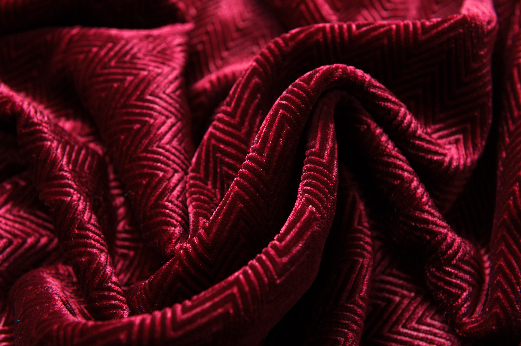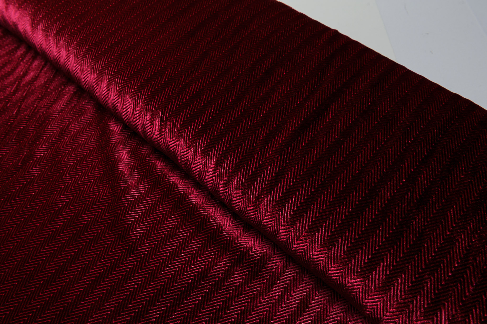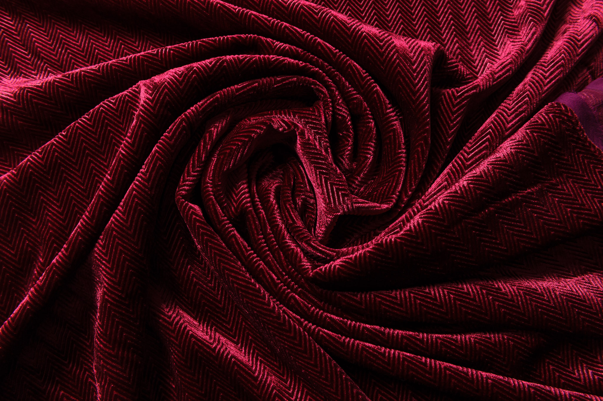 Materiał w kolorze burgundowym w jodełkę, elastyczny, nie prześwituje. Odpowiedni na sukienki, bluzy, bluzki.