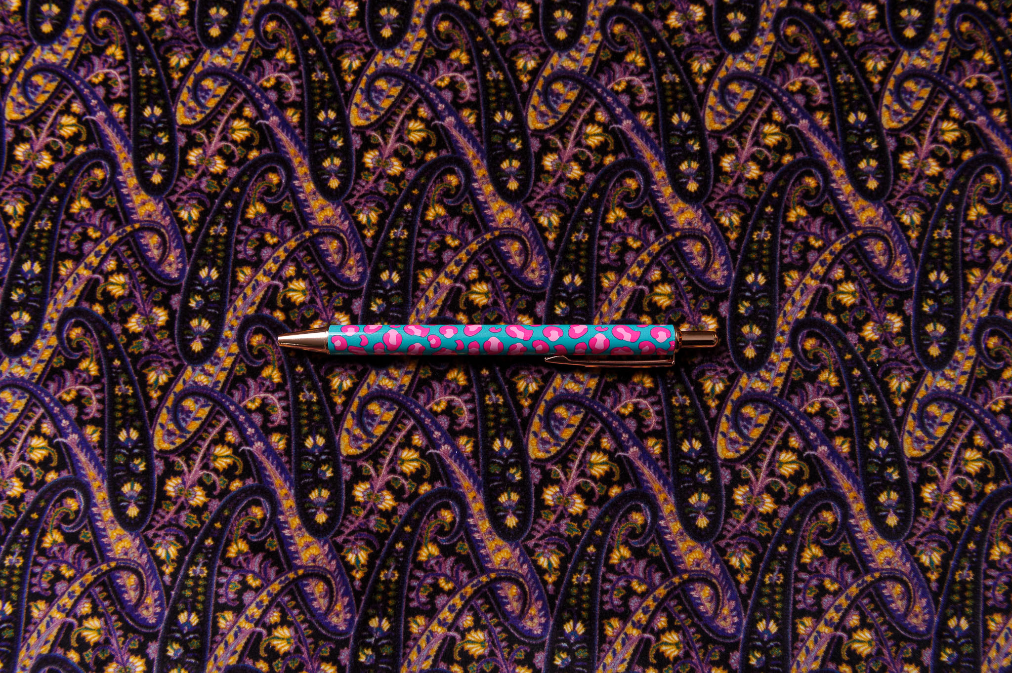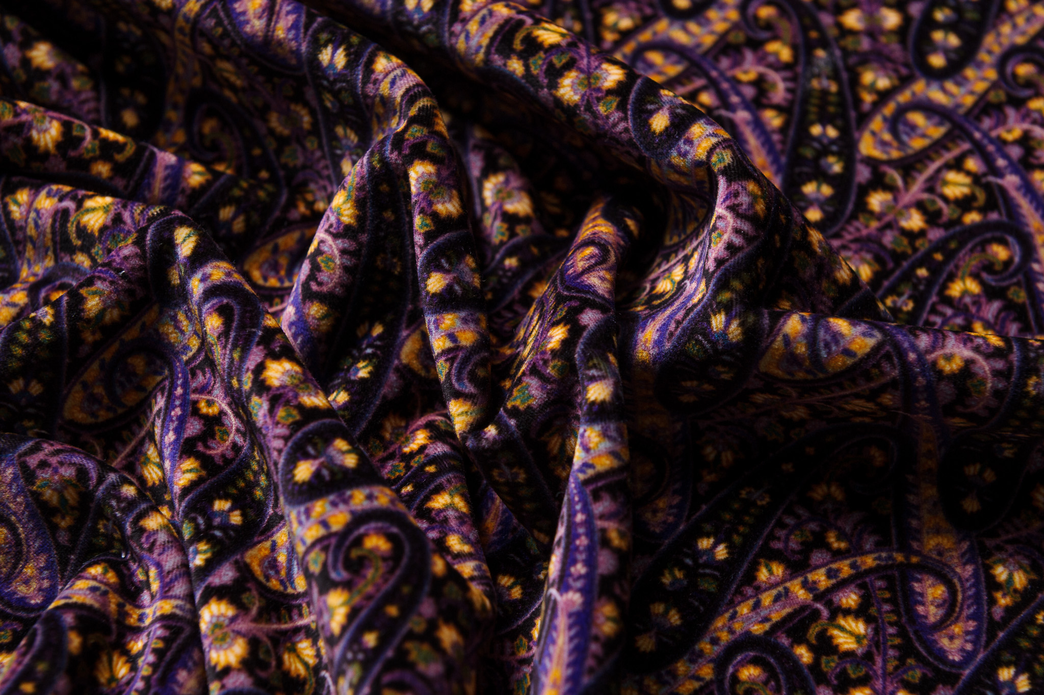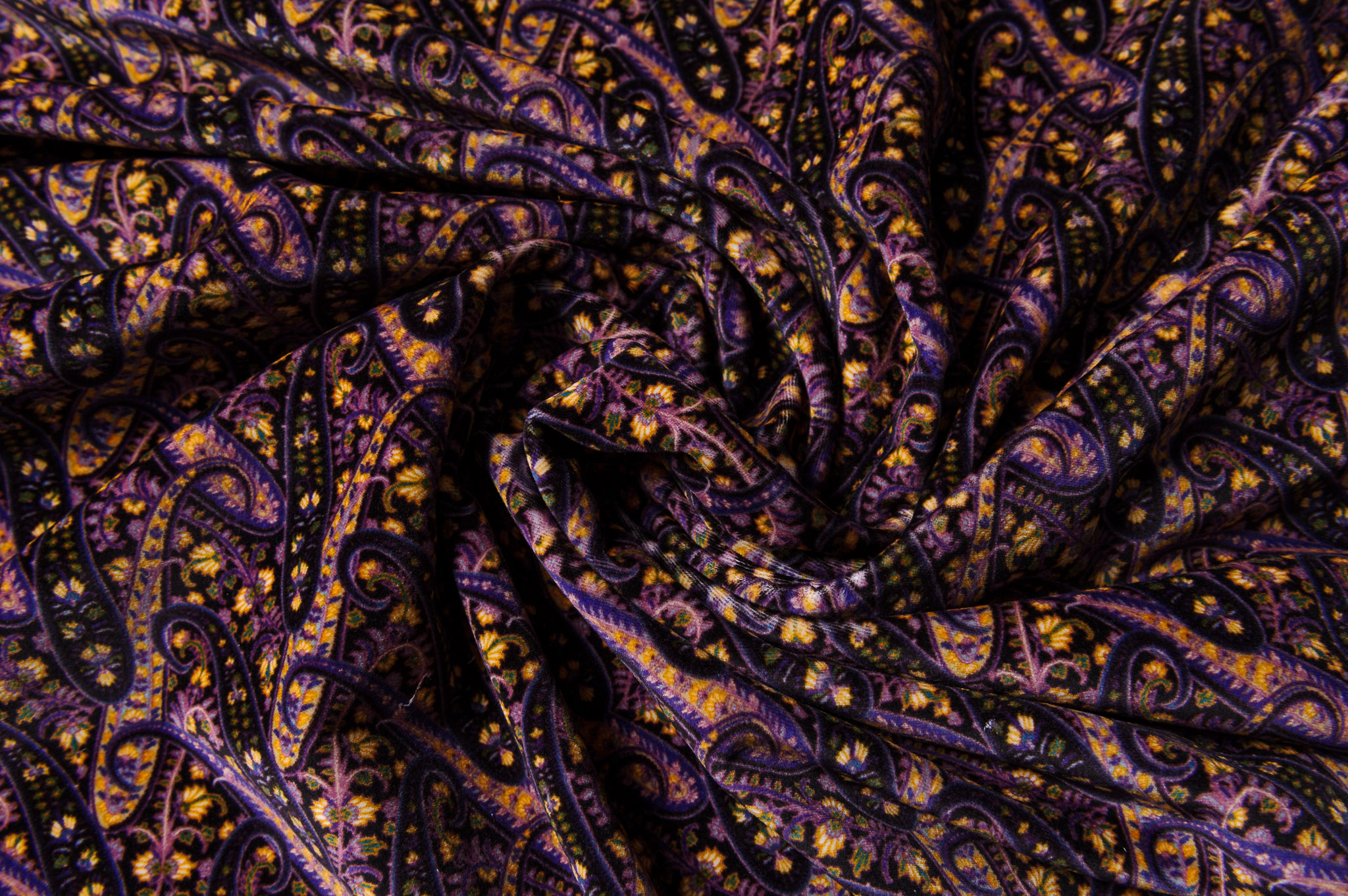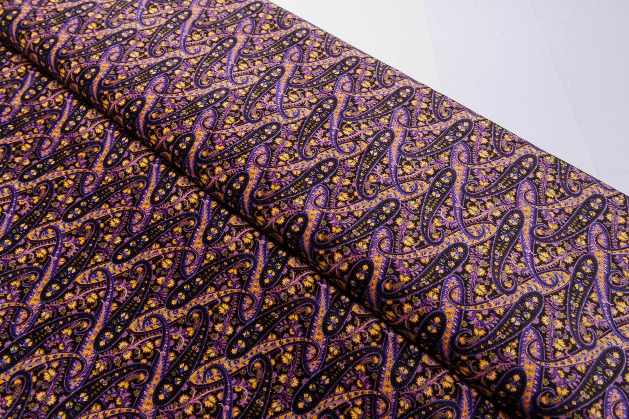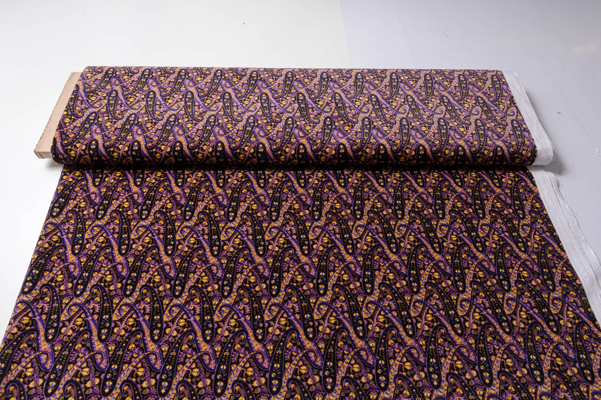 Materiał bardzo przyjemny w dotyku, miękki. Wzór paisley fioletowo-żółty. Odpowiedni na sukienki, bluzy, spodnie.