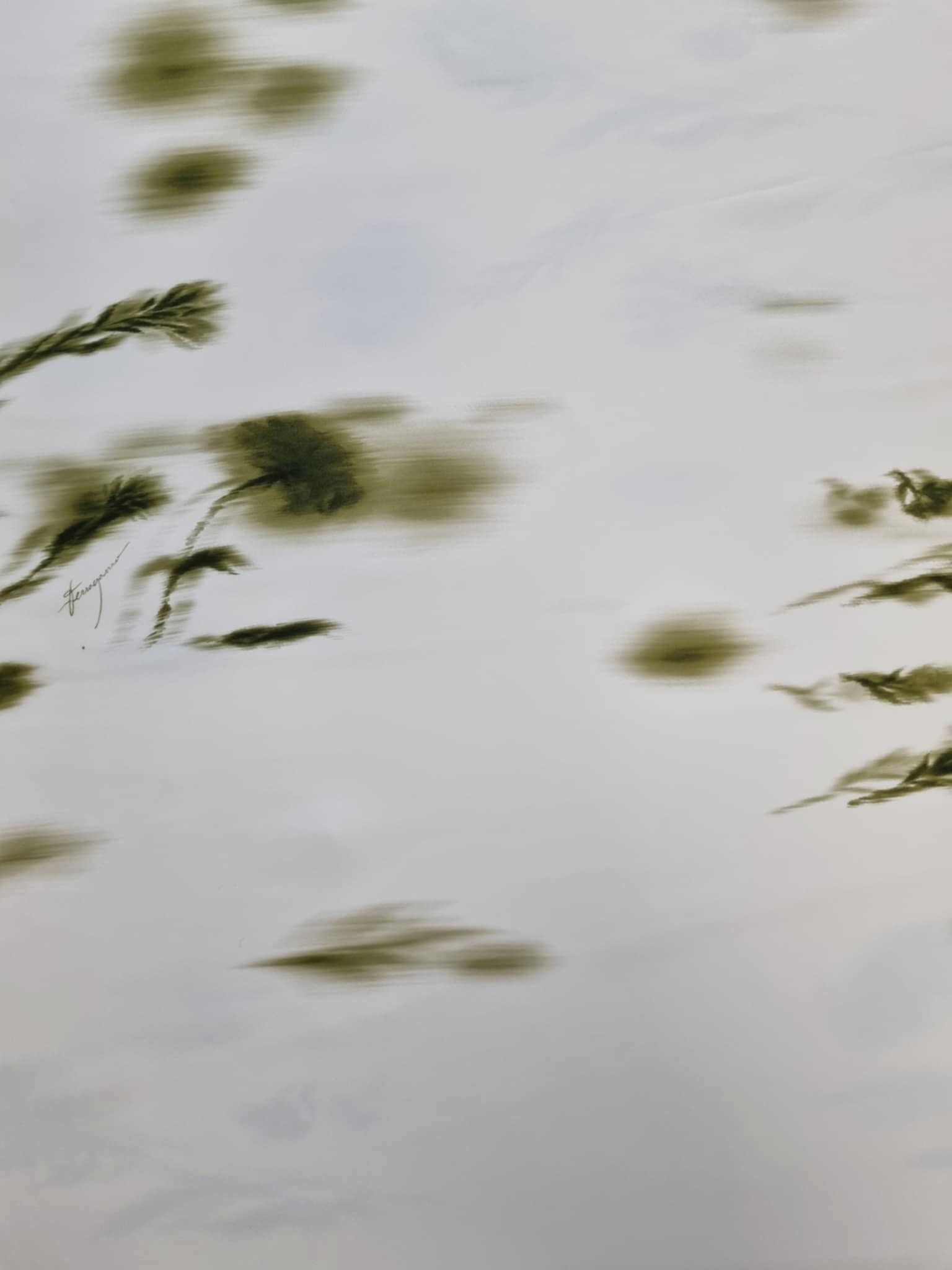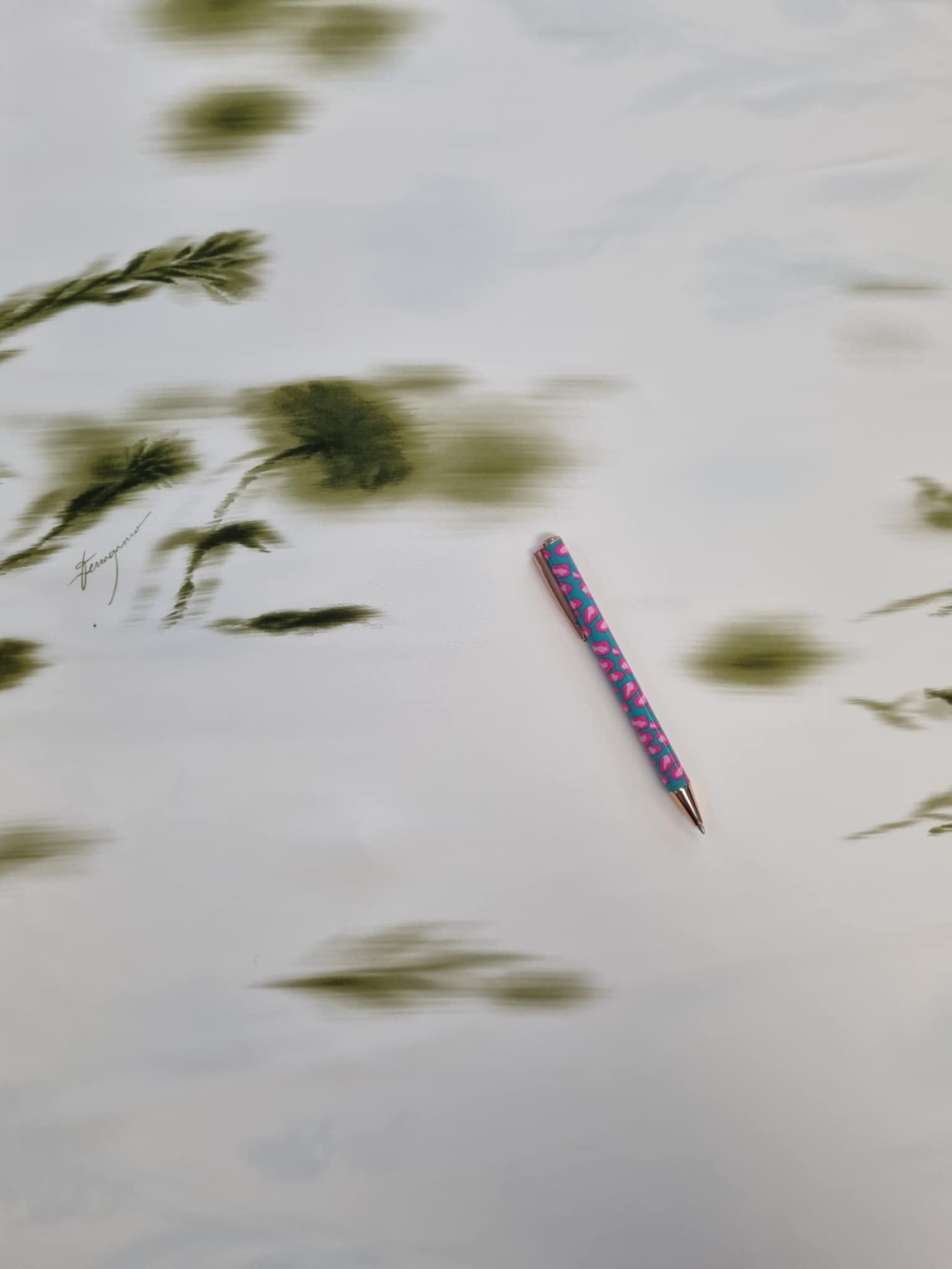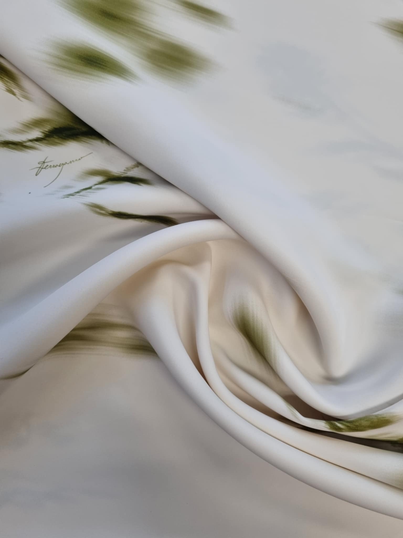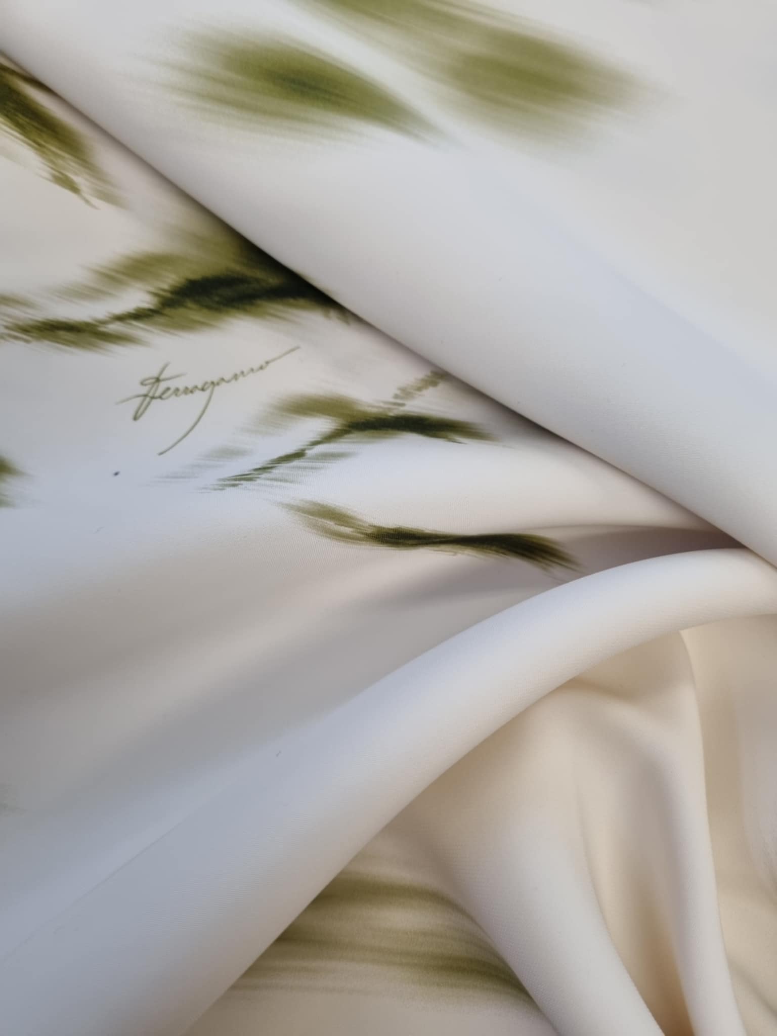 Materiał grubszy, sztywniejszy. Malowane zielone kwiaty rozmyte jakby były malowane farbą. Odpowiednie na żakiet, sukienkę, koszulę.