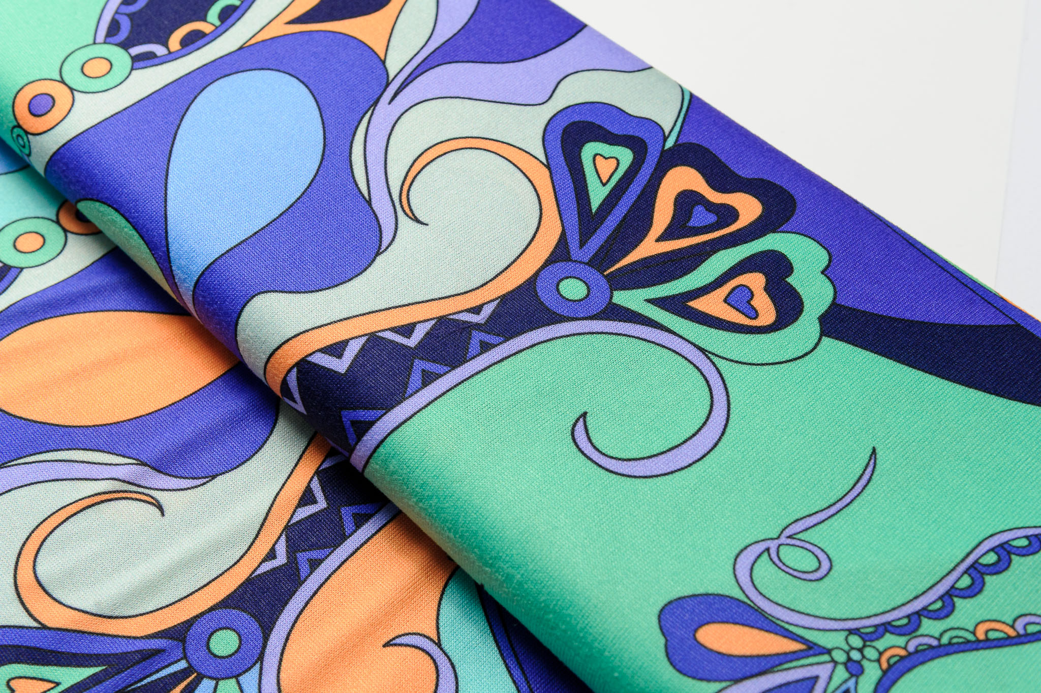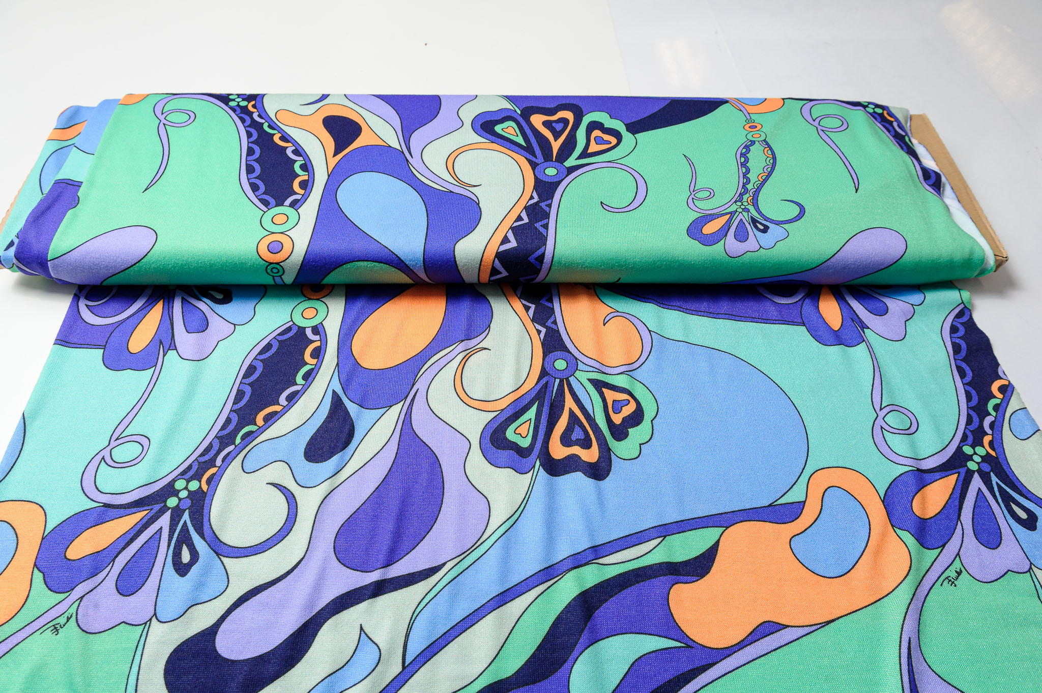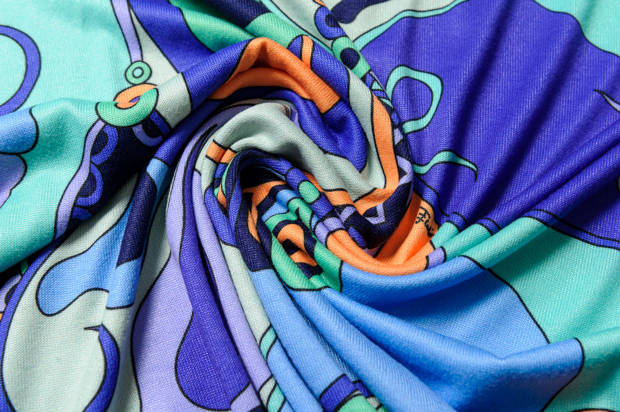 Materiał miękki, elastyczny. Geometryczne, duże wzory w kolorach: pomarańczowym, zielonym, niebieskim. Odpowiedni na bluzy, sukienki, spódnice.