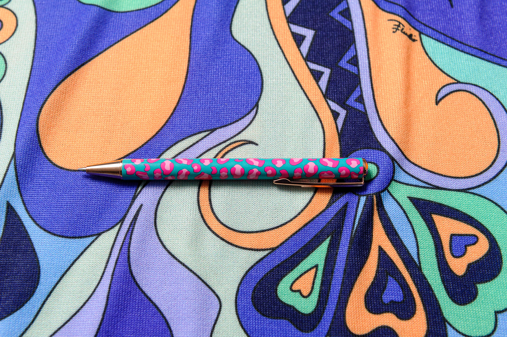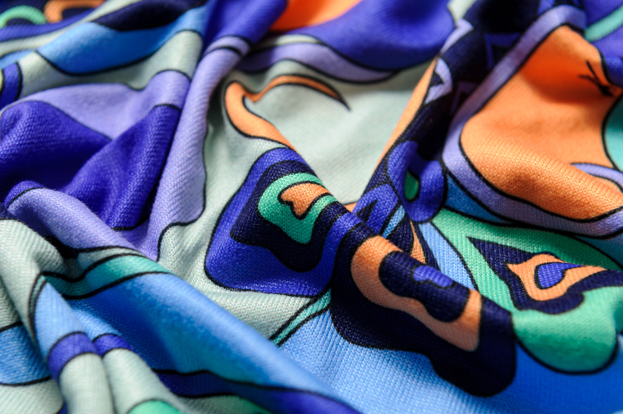Wiskoza w geometryczne wzory pomarańcz/niebieski/zielony